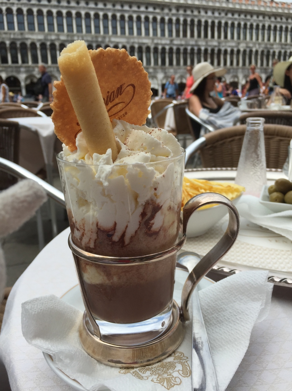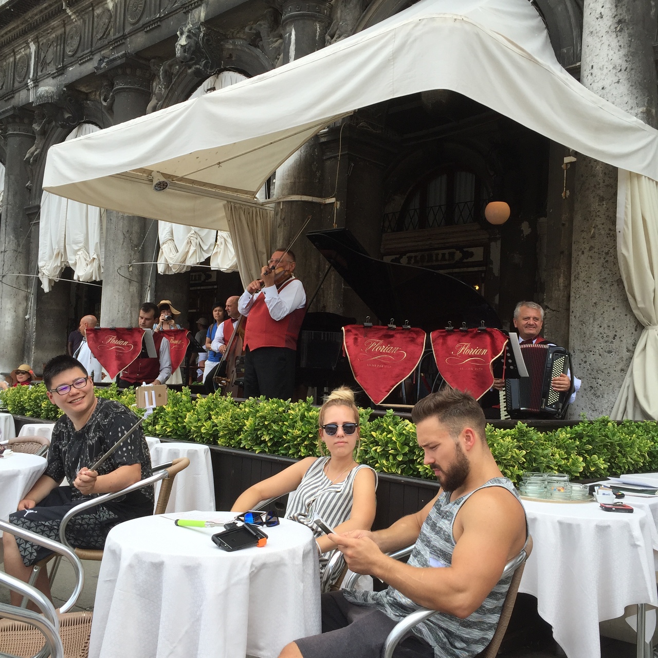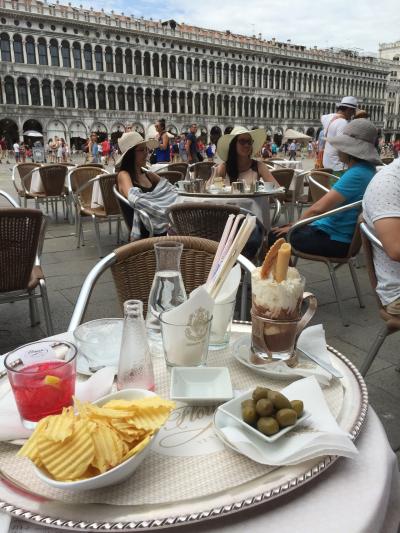 サンマルコ広場に面した老舗カフェ。ヴェネチアを去る日に行きました。せっかくなので、広場に面した屋外のテーブルで、飲み物を頂きました。広場を眺めながら、生演奏を聞きながらの、素敵なティータイムになりました。お値段の方は、皆さん書かれているようにお高くて、