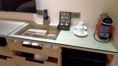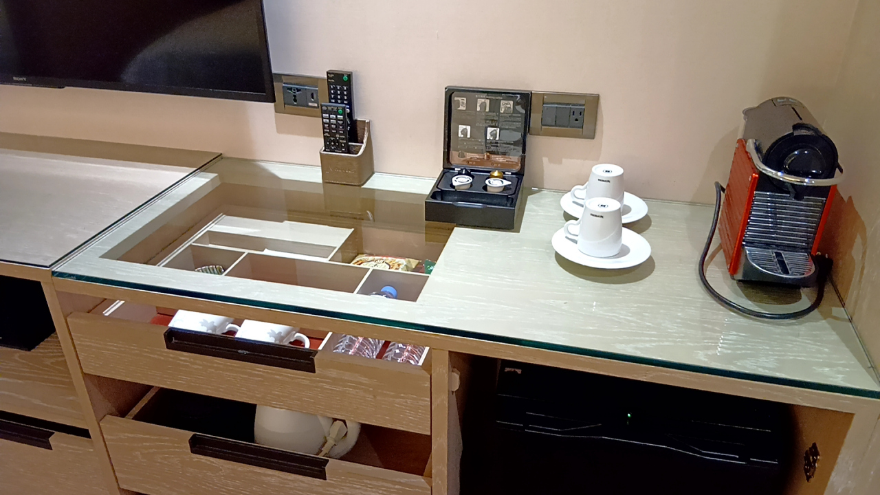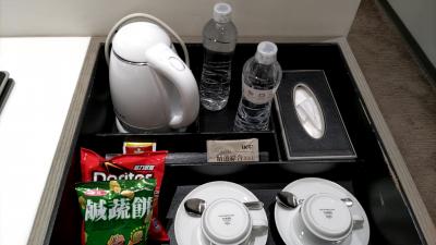 部屋のミニバーに置いてあるボトルウォーター4本・illyのコーヒー・数種類のお茶のティーバッグ・スナック菓子は全て無料、と設備は文句なし。