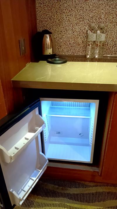 冷蔵庫の中には無料のソフトドリンク3本。電子レンジもある。