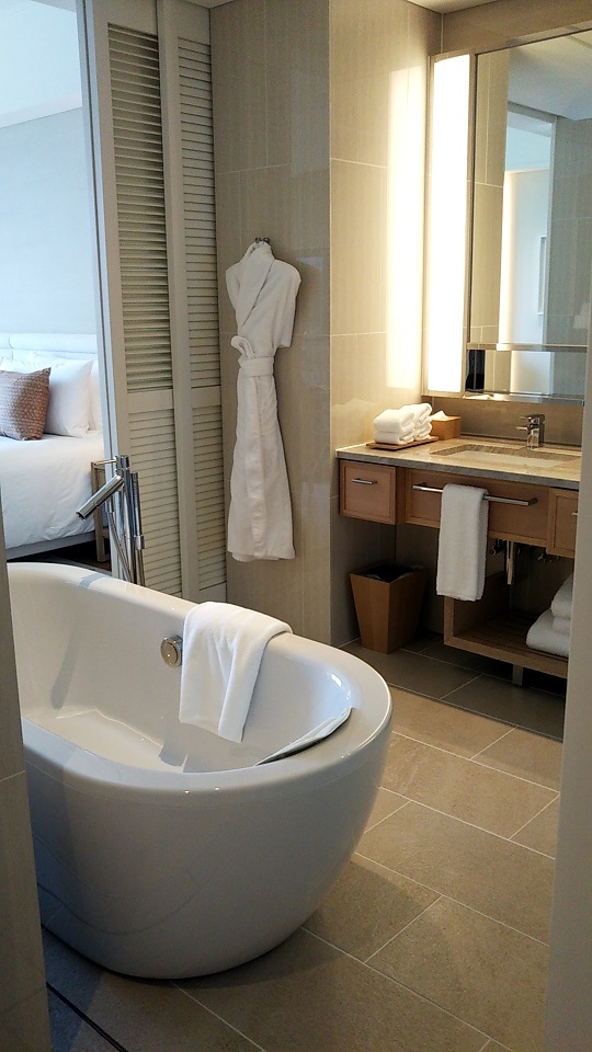 3、洗面台やバスタブのある方は物凄く明るいのに、ベッドのある側は薄暗い。「眠る部屋だから」という理由だとしても暗すぎる。そして翌朝、唯一のベッドサイドのランプが点かなくなった。最悪。