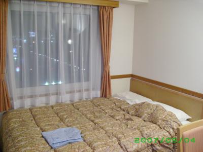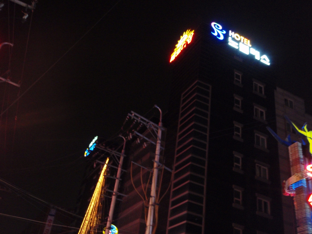 中心地から離れています。地下鉄の駅からは3分。ミョンドンからタクシーで1万2千ウォンくらいでした。日本でいうとラブホテルですが、韓国ではそんな概念はないのか、いわいるキャンペーンクラスのホテルではあてがわれるようです。でも部屋は広いし、ベットも大きくキングサイズ1台にシングル1台の2台あったので、寝るだけと割り切れば十分です。コンビにもすぐ近くにあります。