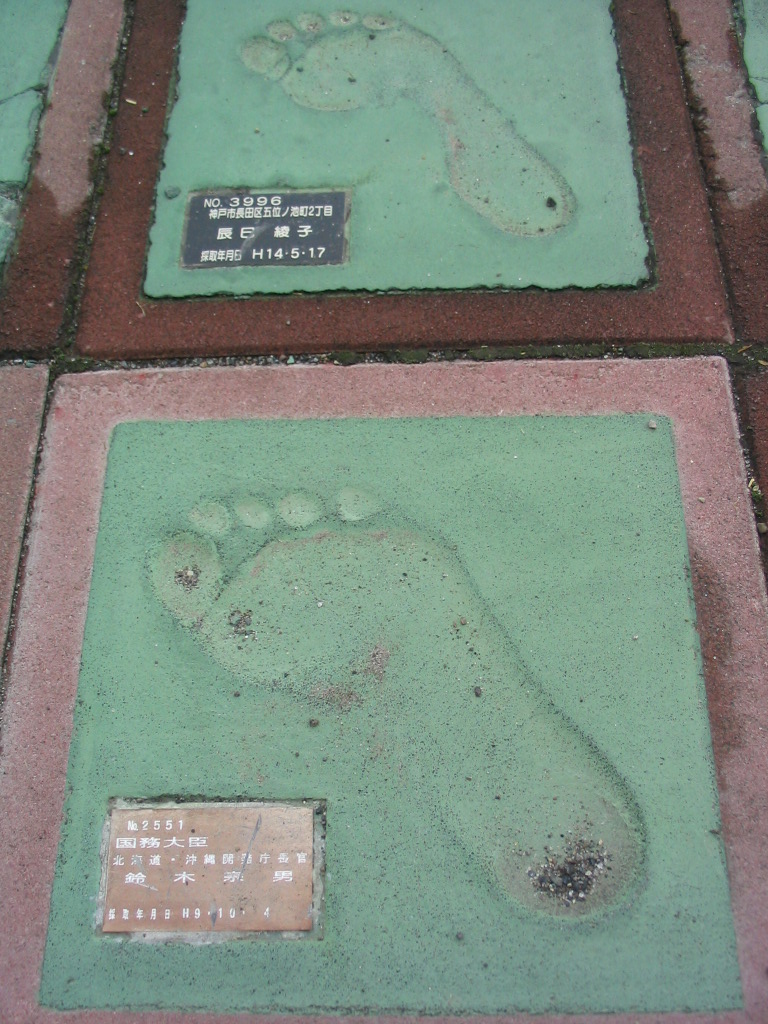 裸足でセメント型に足を乗せて形をとります。その型には採取した年月日・名前などが彫られたプレートを貼って、駅前の商店街の歩道に敷かれます。