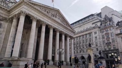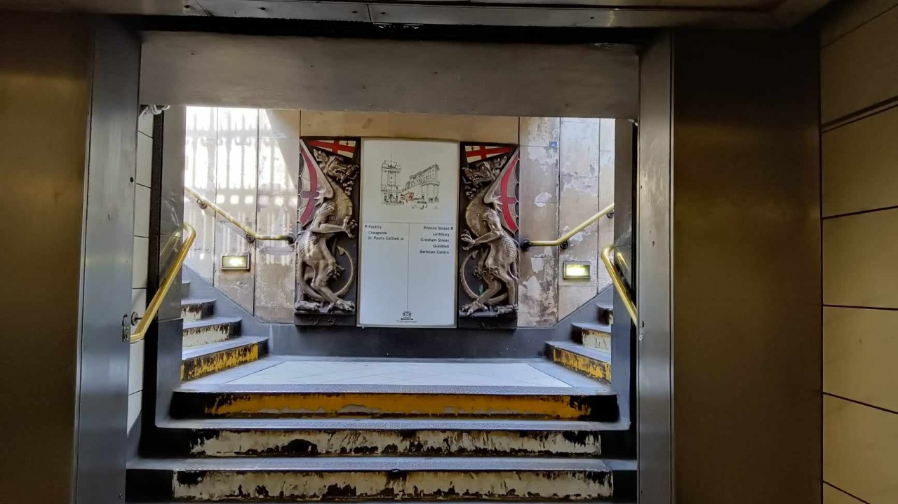 ②駅から出たときの荘厳な景観。特に王立取引所(The royal exchange)は、シティの歴史を感じさせる象徴的な建物です。