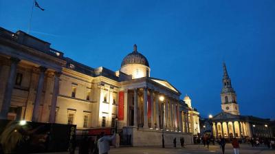正面にはナショナルギャラリー、ナショナルギャラリーから離れてまっすぐ歩いていけばウェストミンスター(ビッグ・ベン)に続く道へ、少し右にそれて奥の道を進めば、バッキンガム宮殿につながる道路「ザ・マル」へ(2024年春時点では工事で閉鎖中)。周辺をあまりにも荘厳な建物に囲まれ、雰囲気バツグンの広場です。