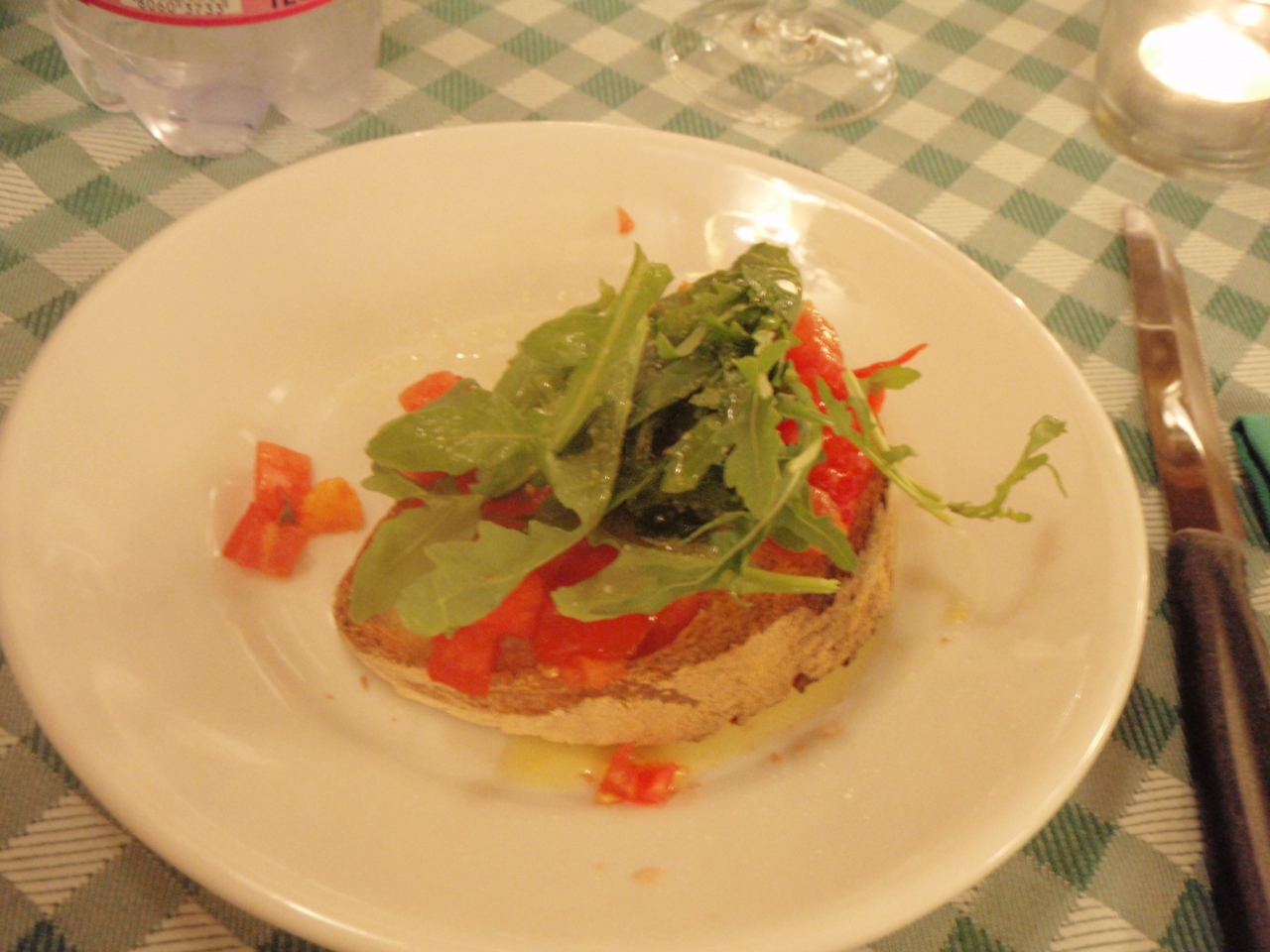 (前菜)写真のブルスケッタのようなもの。塩加減がちょうどよく美味しかった。
