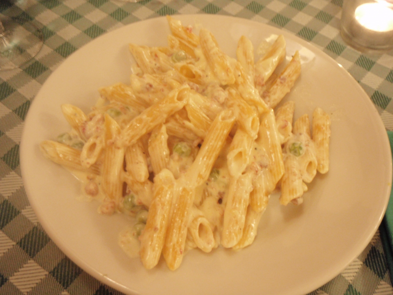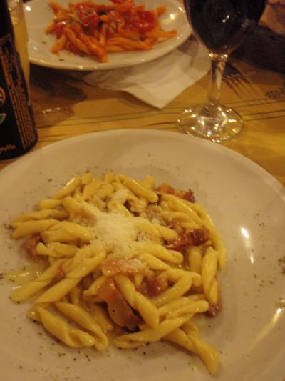 (第一)写真のパスタ。普通。ベーコンとチーズのほうはとてもしょっぱかったです。