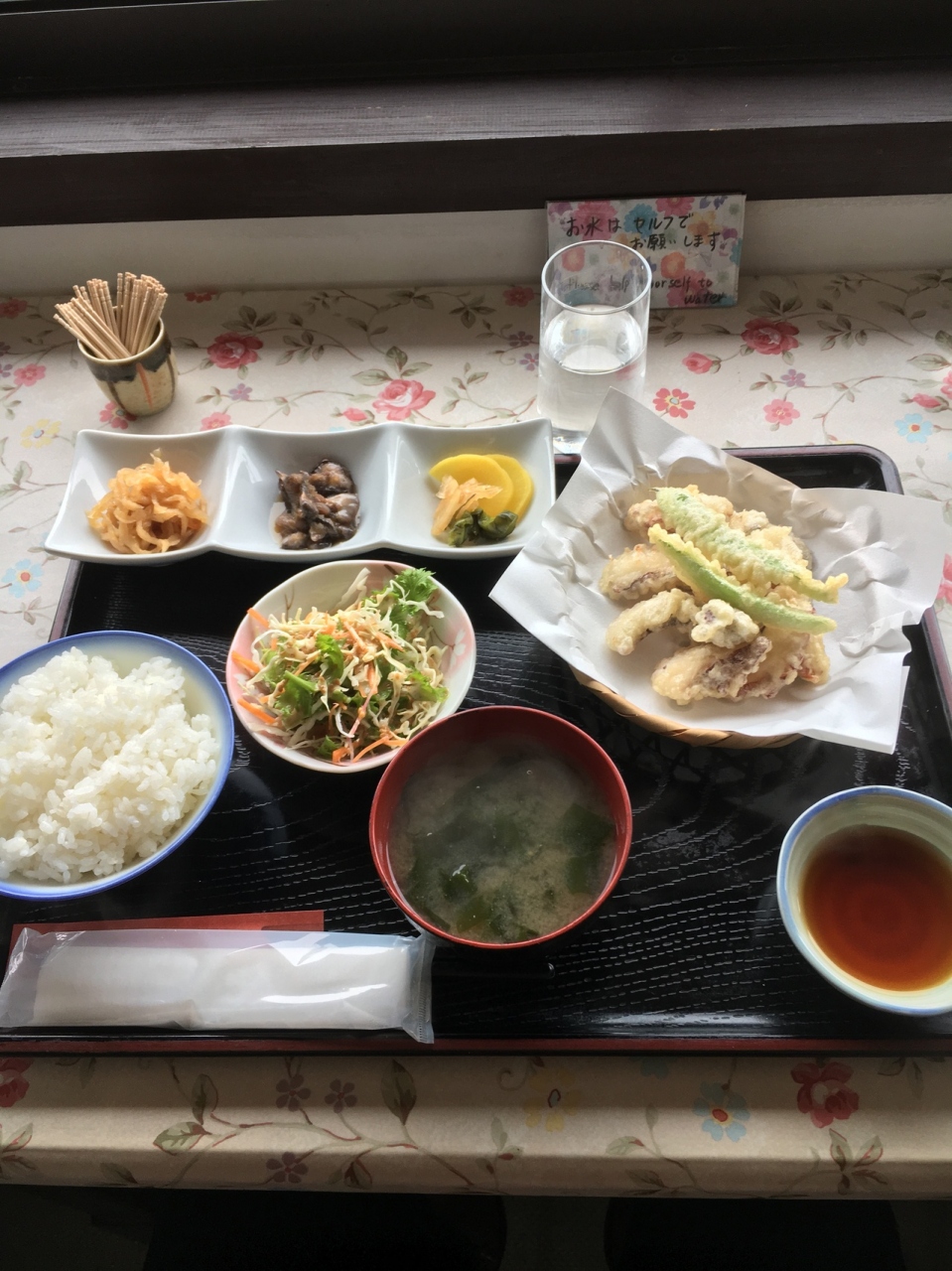 オフシーズンに男木島を訪れたため、食事のとれるお店で空いていたのはこちらのお店のみでした。ランチは5種類ほどあり、たこの天ぷら定食を注文。店内はテーブルと窓に沿ったカウンター席があり、カウンターからは男木島フェリーのりばの方向の景色が見れ、猫がぶらぶらしている様子が伺えます。タコの天ぷらはとても柔らかく、さっと噛み切れてしまうものでした。量もたくさん入っており味も良いものでした。