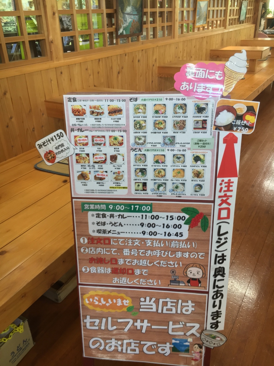 遊覧船乗り場と同じ建物にあるレストランです。券売機で予め食べたいものを購入します。メニューは麺から揚げ物、川魚の塩焼きなどなんでもありました。窓側の席に座れば、立てば吉野川が見えます。団体旅行のバスなどたくさん止まっており、観光地のよくあるレストランになっています。