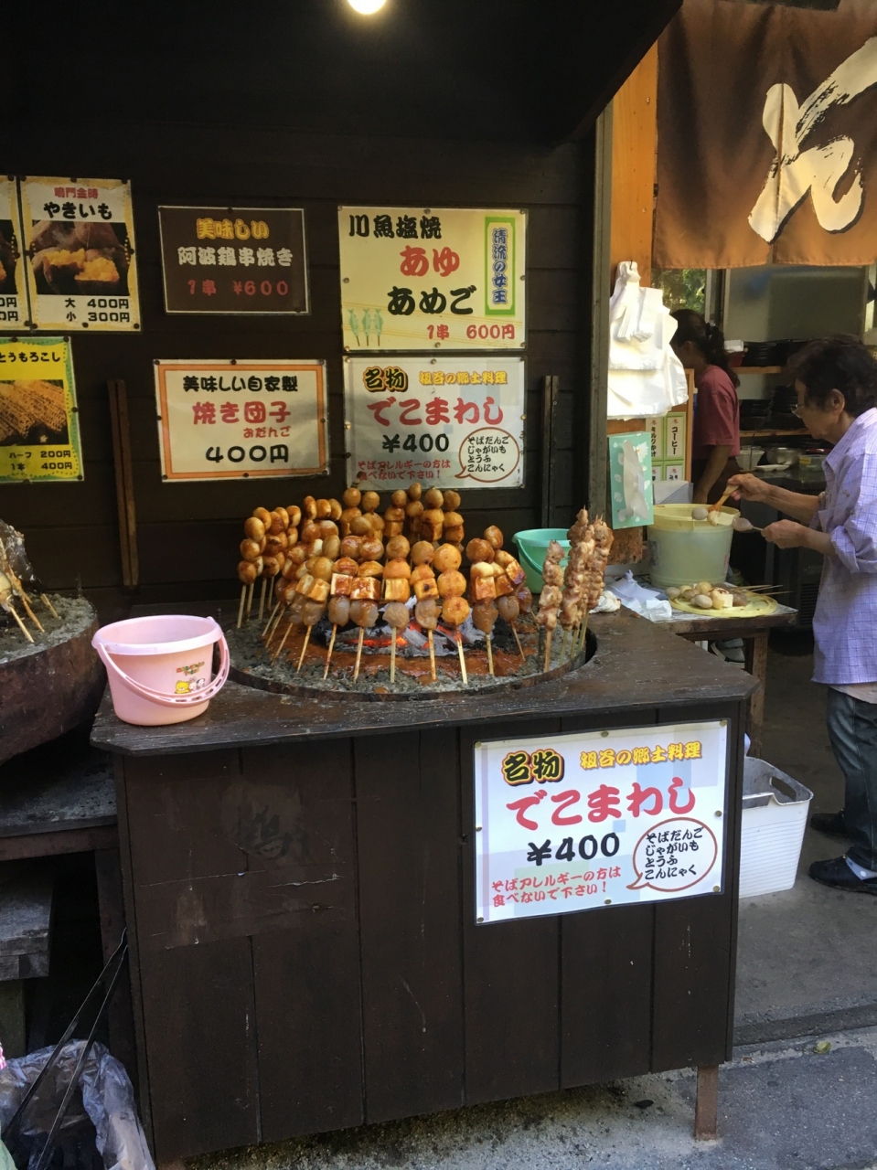 祖谷の名物でこまわしと川魚が店頭で焼かれていました。でこまわしは蕎麦の団子、祖谷の豆腐、祖谷の蒟蒻に味噌がついて焼かれたものです。味噌味のこういったものは他の地域でもありますが、でこまわしはそれぞれの食材に特徴があります。特に豆腐は密度が濃くかなりしっかりしたものでとても美味しかったです。