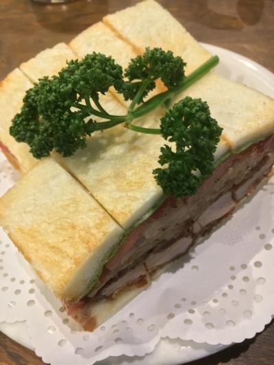 千里中央駅改札を出てすぐの飲食店街にお店はあります。テーブルとカウンターの小さなお店です。売りは野菜入りのカツサンド700円で、持ち帰りは野菜なしになります。ドリンクと一緒に頼むと200円割り引かれます。カツは赤身中心の肉肉しいものですが、噛むとさっくり切れて旨味が広がります。パンは邪魔をせず野菜とソースが爽やかさを演出します。持ち帰りのお客さんも多く、また店内の人もほとんどの方がカツサンドを注文していました。