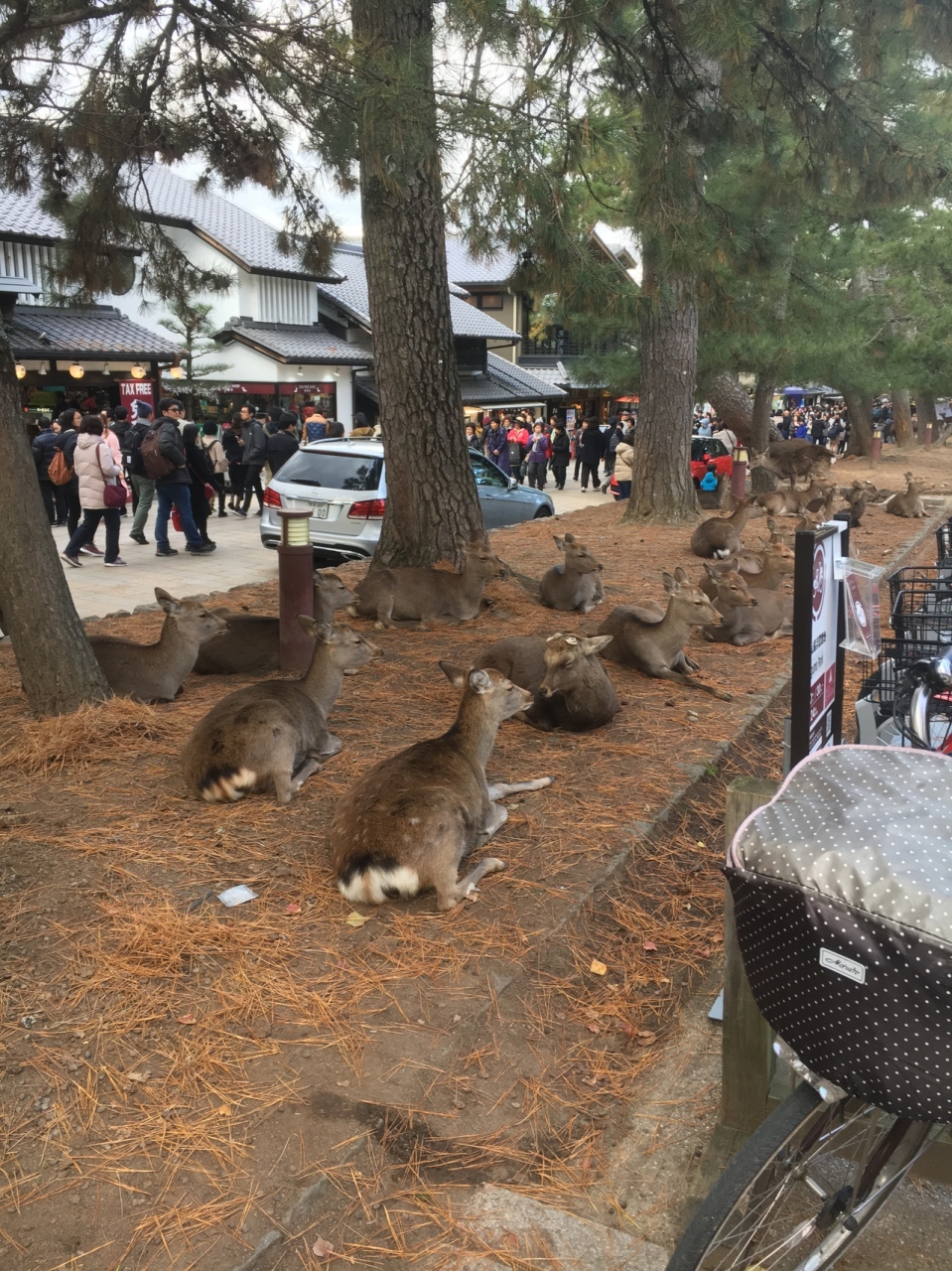 奈良公園は広大な広さで東大寺、春日大社、浮御堂と全て方向が違うので全て回るなら体力がいります。そして公園全体にたくさん鹿がいます。昔は鹿せんべいを持っていたら鹿が沢山迫ってきて怖かったですが、最近は外国人観光客が増えている影響もあるのか沢山貰っているようで、そのようなことはありませんでした。街中にはみ出ている鹿もいて面白いです。