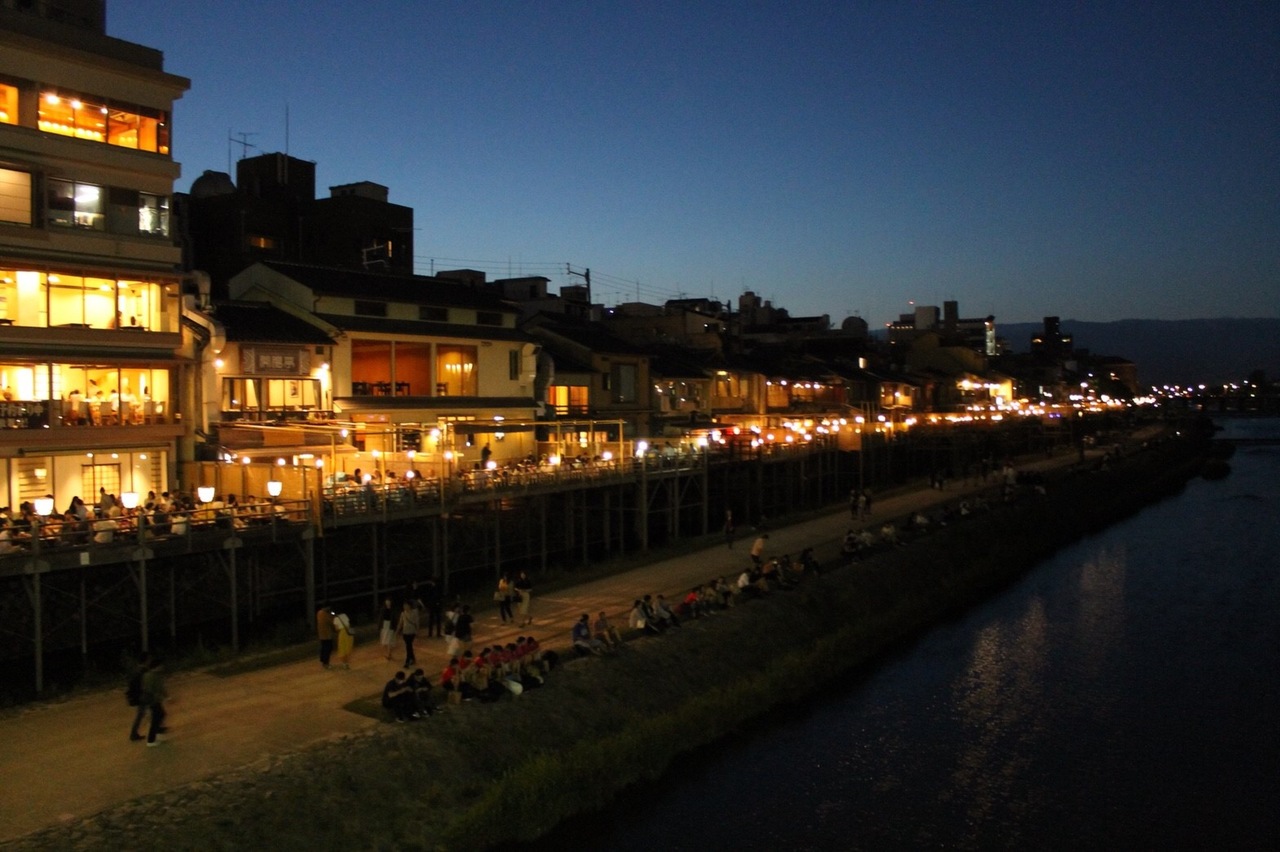 京都と言えば、で思い浮かぶ景色の一つは四条大橋からの鴨川方面の景色ではないでしょうか。いつ通ってもすごい人混みですが、昼と夜、季節によって見え方が違うような気がします。夜はお店の灯りがあり、川を通る風も相まっていい味を出していました。