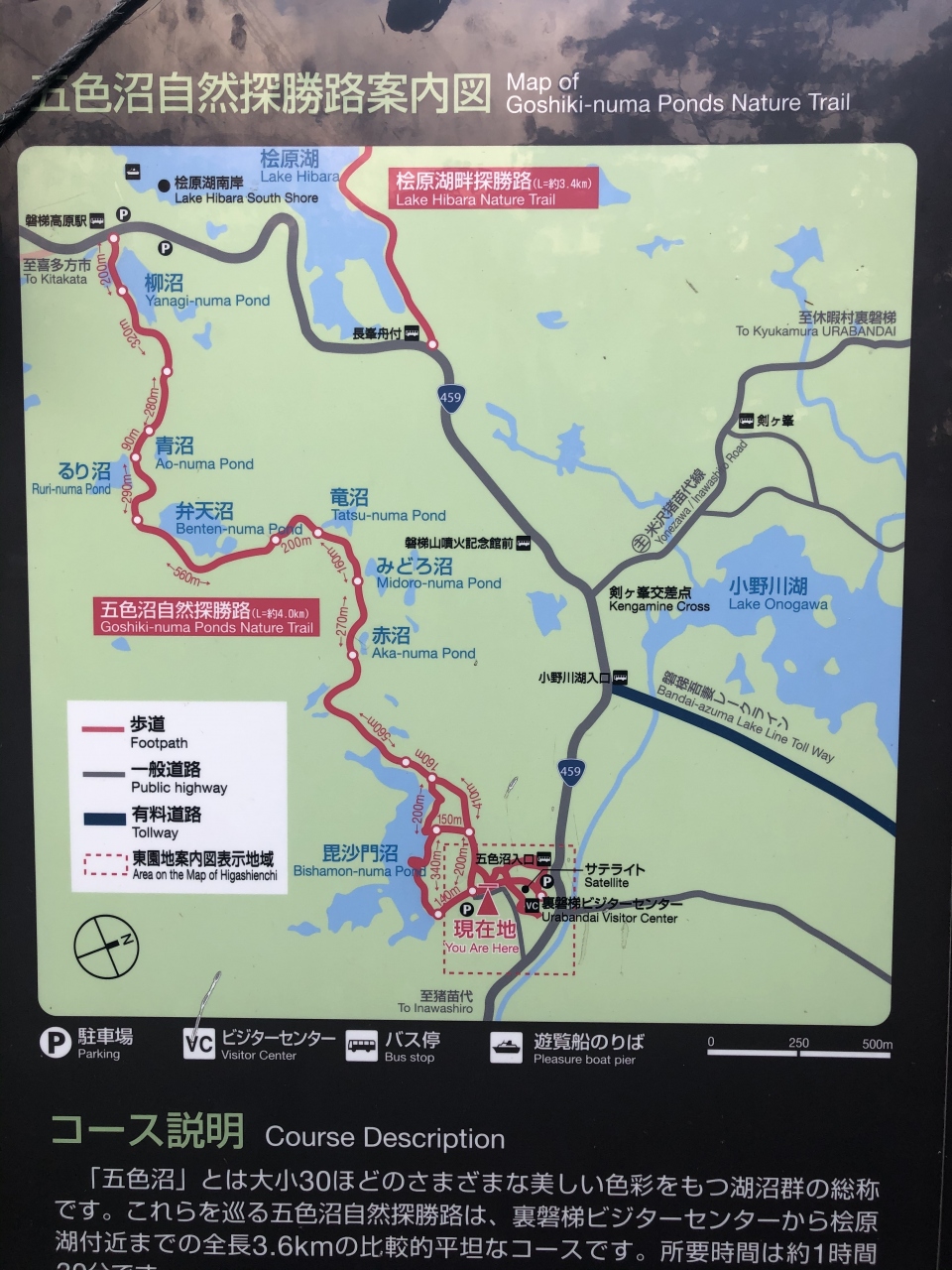 1888年の磐梯山の噴火によって100を超える湖沼ができた。磐梯山の北側は裏磐梯と呼ばれ、毘沙門沼・赤沼・みどろ沼・竜沼・弁天沼・るり沼・青沼・柳沼などの湖沼が五色沼湖沼群と呼ばれる。沼に含まれる鉱物のためエメラルドグリーン、コバルトブルー、ターコイズブルー、エメラルドブルー、パステルブルーなど季節や天気や時間帯によって微妙に色彩が多様に変化する。- 旅行時期