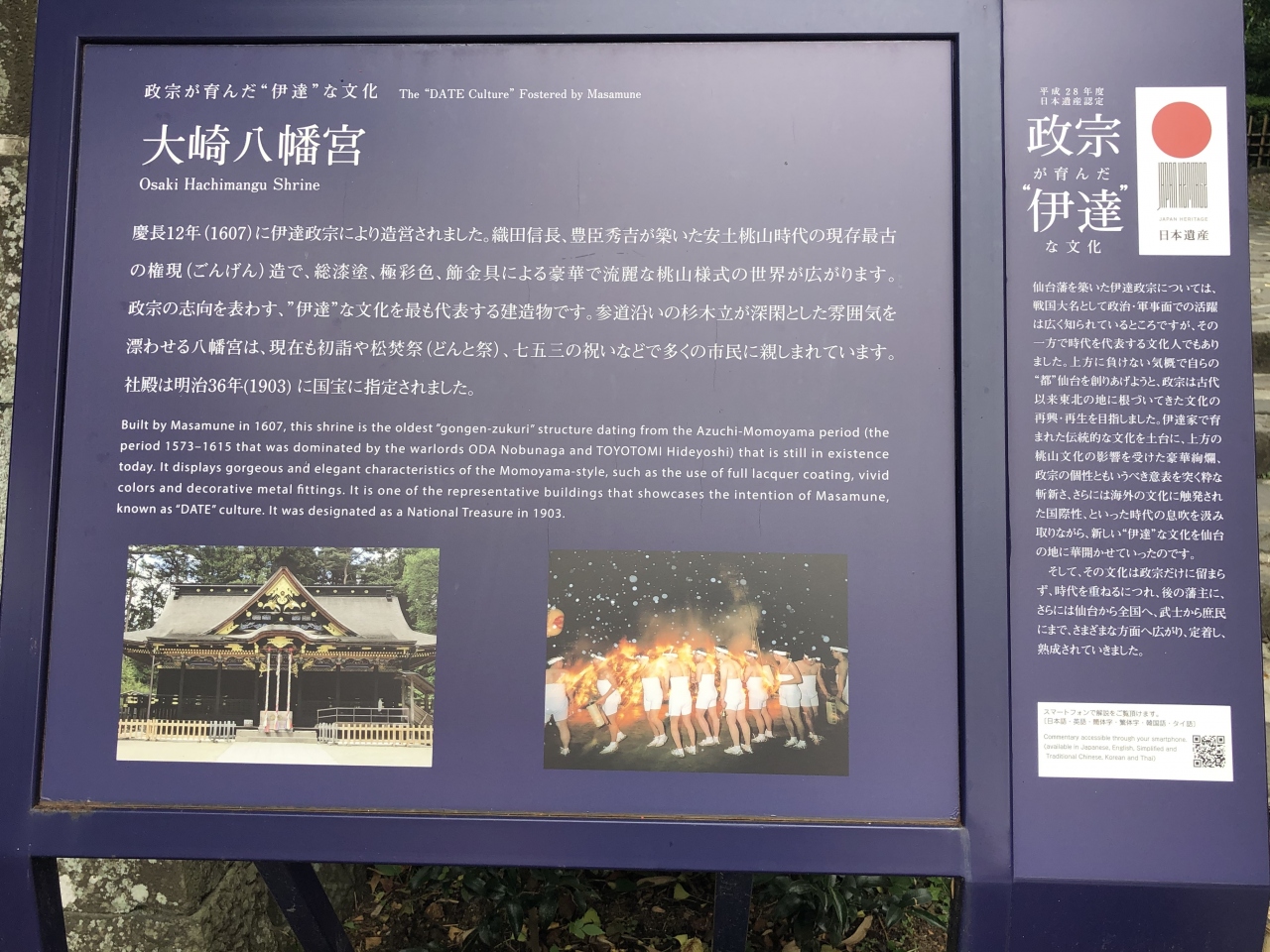 1607年伊達政宗公によって創建された権現造の典型、本殿・石の間・拝殿が一体となった社殿は絢爛豪華。内外とも漆塗・胡粉下地に彩色を施し、彫刻・金具に飾られた桃山建築の傑作と言われている。大崎八幡宮の名は、室町時代に奥州管領大崎氏が岩手県水沢市に築いた鎮守府八幡宮に由来するという。- 旅行時期
