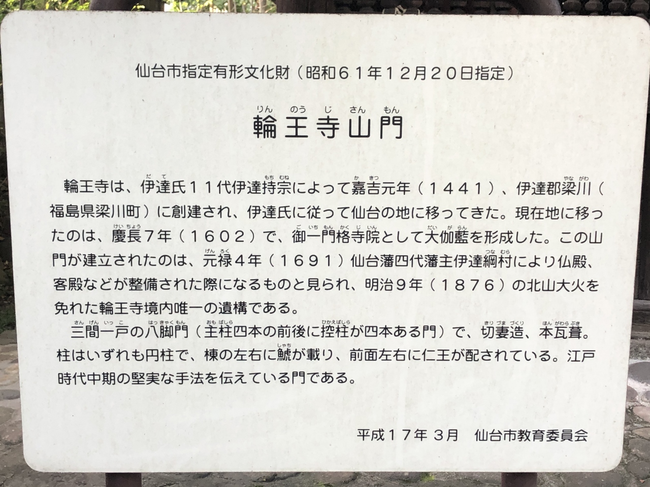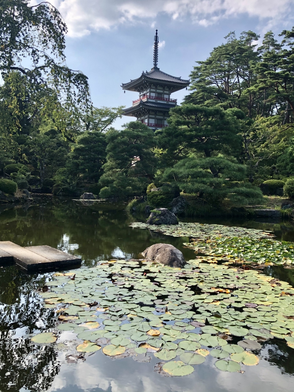 寺は1441年、伊達政宗の夫人蘭庭明玉禅尼の発願により福島県梁川に創建、伊達氏の居城が仙台に移されたため、1602年に寺も仙台に移された。その後度重なる火災で主要な建物は焼失、1900年代前半に再建されるも2011年の東日本大震災で仁王門を除く大半が倒壊した。近年庭園、三重塔が整備された。モネの睡蓮を思い出させる池から眺める三重塔は印象的である。- 旅行時期