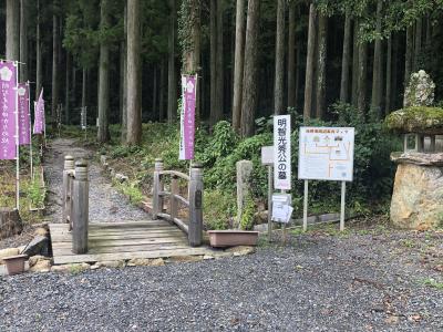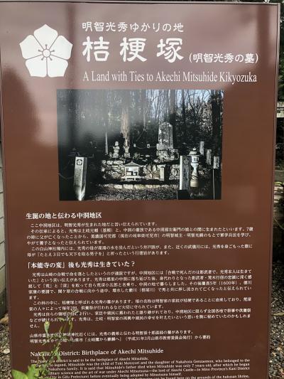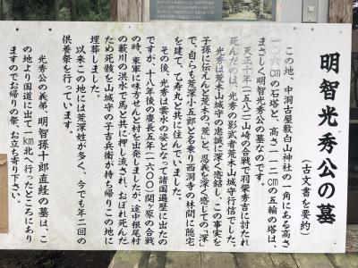 この塚の解説によれば、「1582年本能寺の変の後、山崎の合戦で秀吉に敗れ討たれたのは影武者荒木山城守行信で、光秀自身は難を逃れ諸国を遍歴した。1600年の関ヶ原の戦いに東軍に味方するため参戦したが、途中洪水に巻き込まれ死去、行信の子孫がこの地に持ち帰り埋葬した」とある。もちろん信じるか、信じないかは各自の自由である。- 旅行時期
