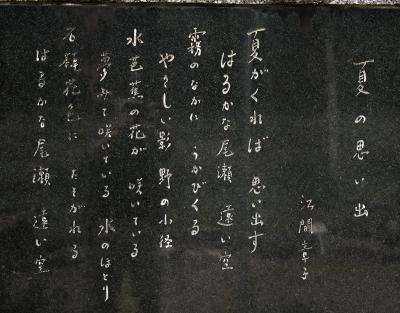 水芭蕉やニッコウキスゲ、コマクサなど尾瀬や近隣の山々に咲く草花を中心に植栽してあり、 園内には、「尾瀬書美術館思郷館」、「武田久吉メモリアルホール」、山岳写真家白籏史朗氏の「尾瀬写真美術館」、名曲「夏の思い出」を作詞した江間章子氏自筆の「夏の思い出詩碑」、作曲した中田喜直氏の「夏の思い出譜碑」が設置されている。- 旅行時期