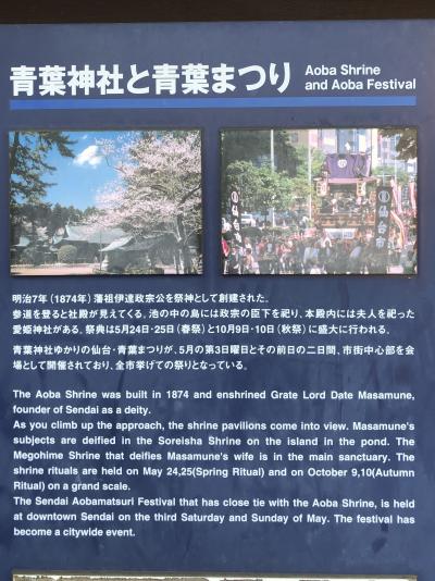 青葉神社は藩祖伊達政宗公を祭神(武振彦命)として1874年に創建された比較的新しい神社。緑に覆われた参道は市民の散歩道となっており、神聖な雰囲気を持っている。仙台市の至る所、正宗公ゆかりの寺社に出会うが、その御威光の大きさを知るパワースポットである。- 旅行時期