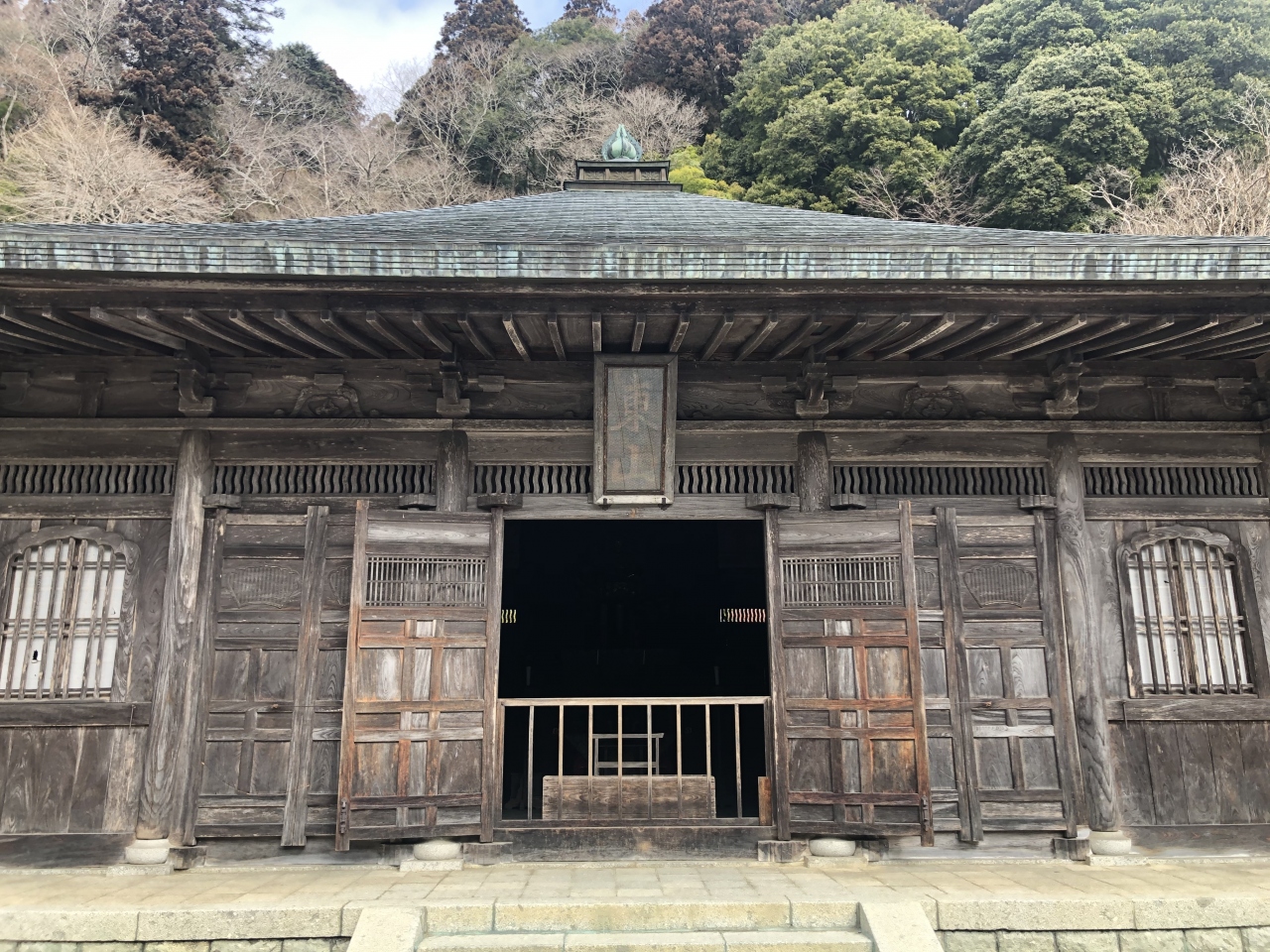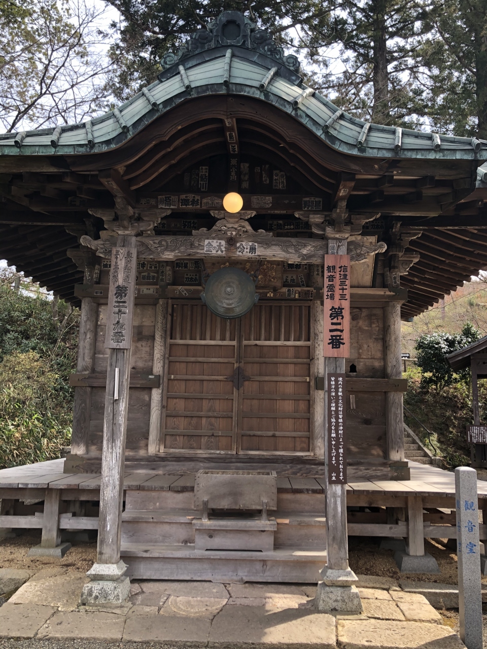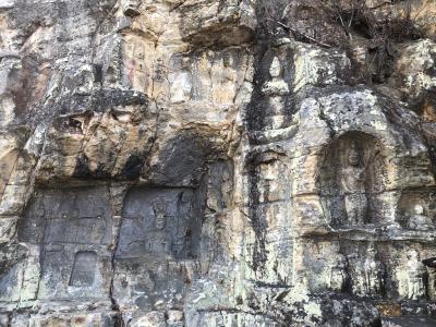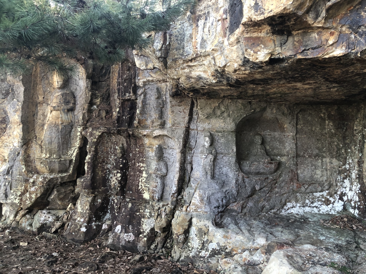 岩谷観音の摩崖仏の規模はさらに小さい。信夫山の中腹、東側の岸壁に掘られており、三十三観音、地蔵尊、不動尊など60余対が刻まれている。平安時代の末期から鎌倉時代にかけて、この地を支配していた豪族、伊賀良目氏が岩をくりぬいて造ったお堂に、持仏の聖観音を祀った。その後独立した観音堂が建立され現在の観音堂は1614年頃に再建されたものであるという。- 旅行時期