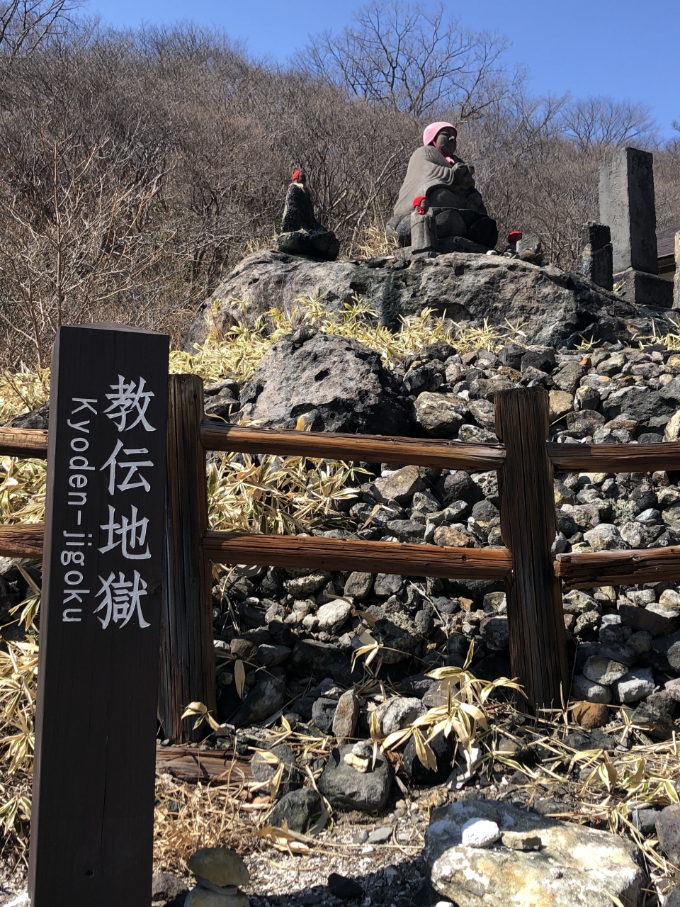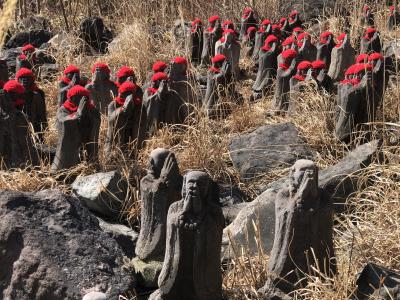 「奥の細道」を辿る旅、雲巌寺に続いて車で殺生石を訪れた。芭蕉は1689年4月にここを訪れ、「殺生石は、いで湯のいづる山陰にあり。石の毒気いまだ滅びず、蜂、蝶のたぐひ真砂の色の見えぬほどかさなり死す。」と記している。確かに付近一帯は亜硫酸ガスのにおいが立ち込め、有毒火山ガス量が多い時は立ち入り禁止になるそうだ。周囲は荒れ果てた草木が全く生えない火山地形で、「賽の河原」には「野仏群」「千体地蔵」「教伝地蔵」がならんで、地獄の雰囲気を盛り上げている。
