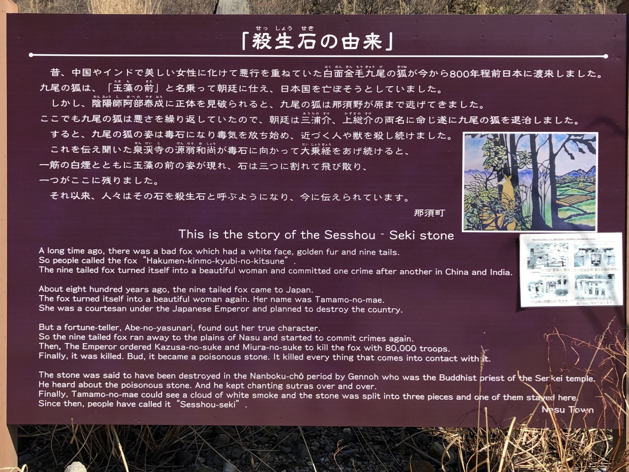 平安時代の初め、鳥羽上皇が寵愛したという伝説の女性・玉藻前(実はインド、中国を荒らし回った妖怪九尾の狐)が、正体をを見破られ、逃げた先の那須の地で討伐されて石となったという。その後も石は毒を発して人々や生き物の命を奪い続けたため「殺生石」と呼ばれ、1385年に玄翁和尚によって3つに打ち砕かれ全国に飛散したという。- 旅行時期