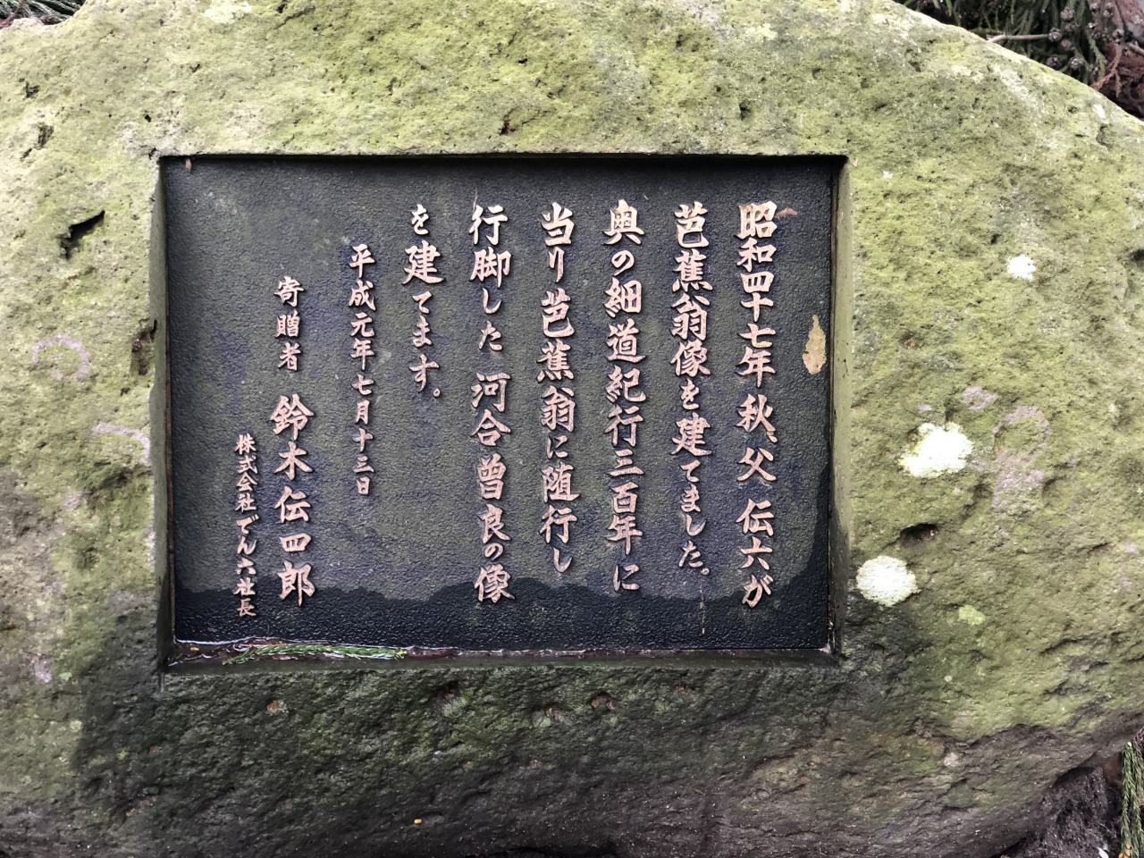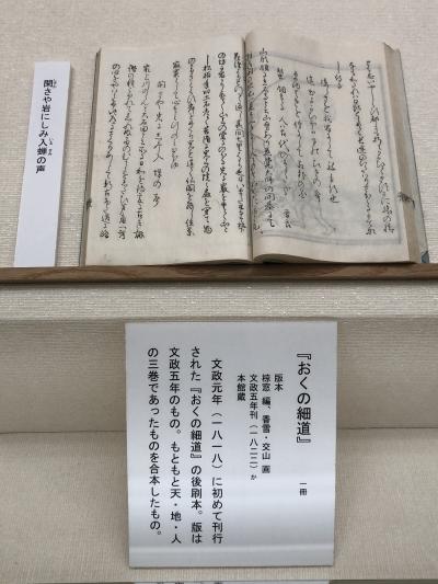 芭蕉記念館は深川、須賀川、大垣など訪れたが、この記念館の特徴は「山寺」という周囲の環境を考慮、目の前に山寺の全景を見上げる場所に位置、芭蕉自筆の書作が多数展示されていることである。また屋外には、元米国駐日大使ライシャワー博士の紀行文碑があり興味深い。- 旅行時期