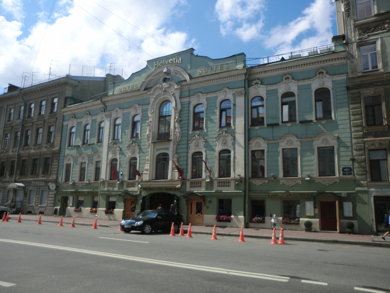 ネフスキー通りに近いマラタ通りの由緒あるホテル、スイス建築家の設計で、スイス領事館も同居する格調高い内装、外装を持つ。地下鉄マヤコフスカヤ駅、モスクワ駅に近く、ドストエフスキー文学記念博物館、モスクワ駅、北極・南極博物館も徒歩圏内
