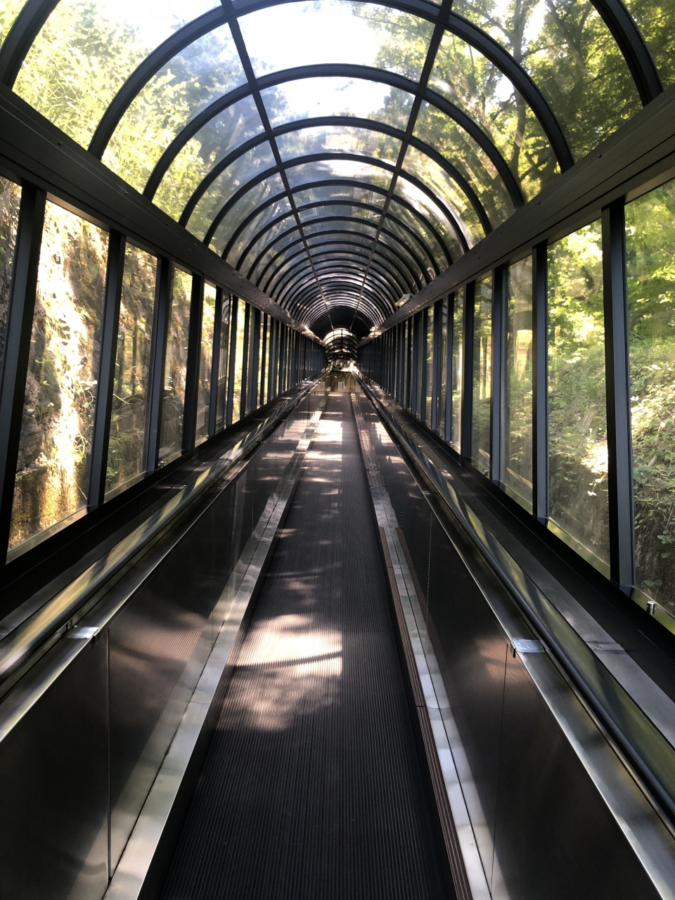 スロープコンベアは二つに分かれており、途中で降りることもできる。階段を登っても10分ほどでさほど差はないが、強い日差しを避けることはできた。250円の価値はある。- 旅行時期