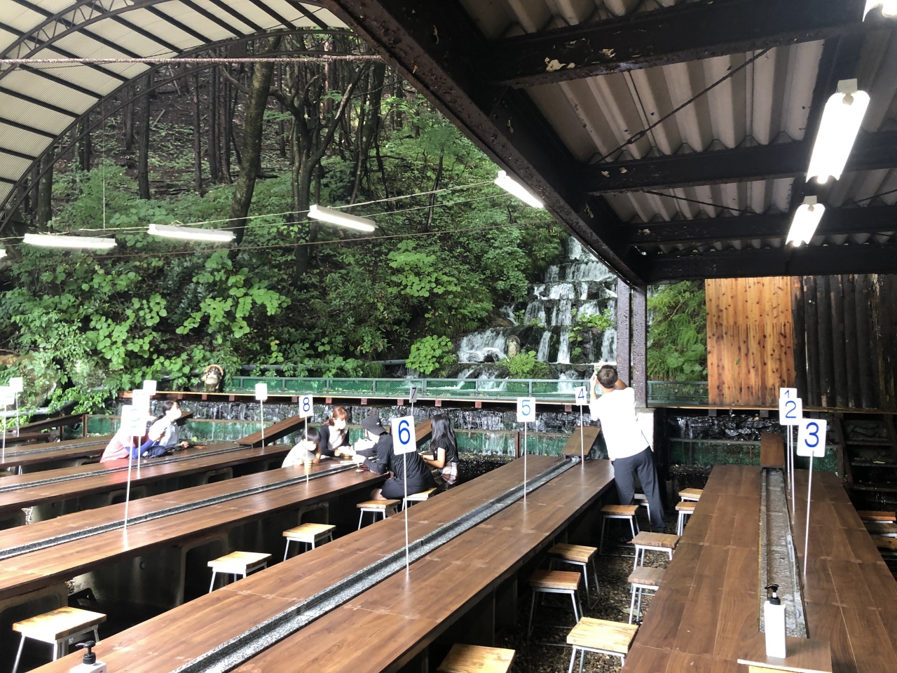 家族を伴って福島市をドライブ、流しそうめんの店吾妻庵を訪れた。狭い山道をかなり上っていく大自然のただなかにある店。市内から車で30分以上、かなり人気の店で、10組以上の行列ができていた。流しそうめんの店であるが、このご時世、個別の注文も可能、ますの塩焼きとクレソンの天ぷらがついて1,800円がおすすめメニュー、その他ます、いわな、天ぷら定食も選べる。