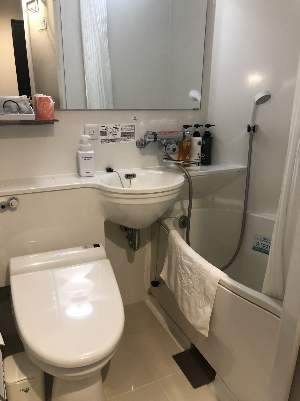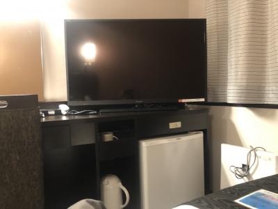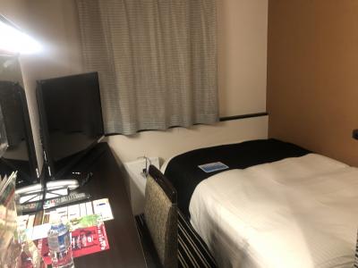部屋、設備はアパホテルスタンダード、狭いが、素泊まりには不満はない。フロントは6階にあり、その上が客室となっている。テレビは大型、冷蔵庫、浴室のアメニティなど設備は十分。- 旅行時期