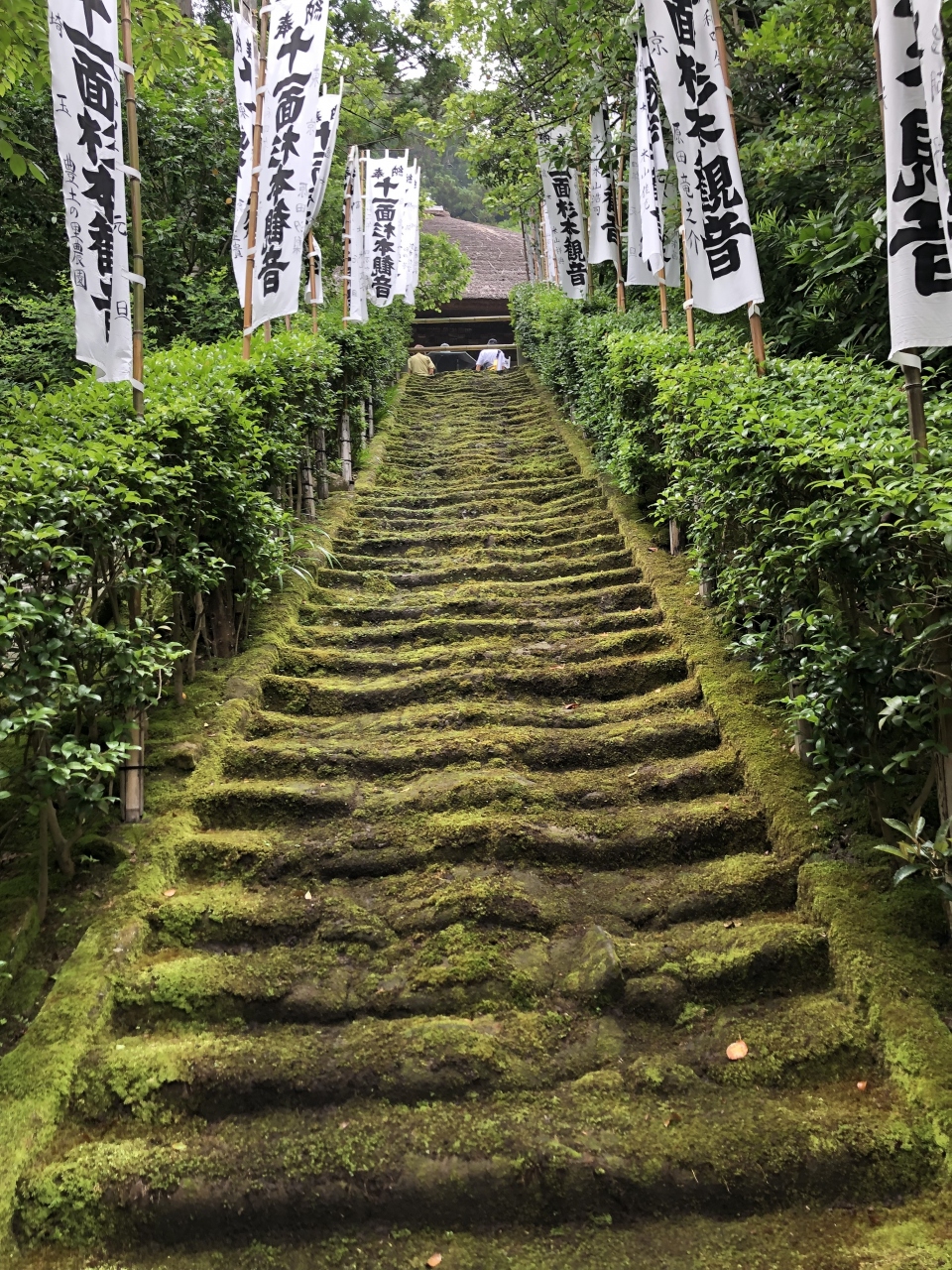 本殿には階段をかなり上ることが必要、山門から本堂までの「苔の石段」は現在は通行不可で、左手に作られた階段を登る。行基が開山、源頼朝入府以前からあった鎌倉最古の霊場である。