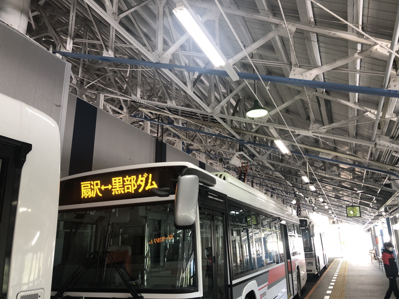 黒部第4ダムを訪れた。トロリーバスでの運行は2018年が最終年。2019年より新たにリチウム電池を積んだ電気バスが走り始めた。国立公園の環境保護を考慮したクリーンな乗り物、2021年9月23日現在、料金は往復2610円、約30分毎に3台が編成を組んで走行している。