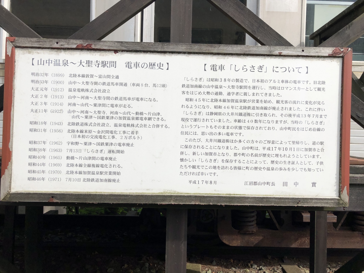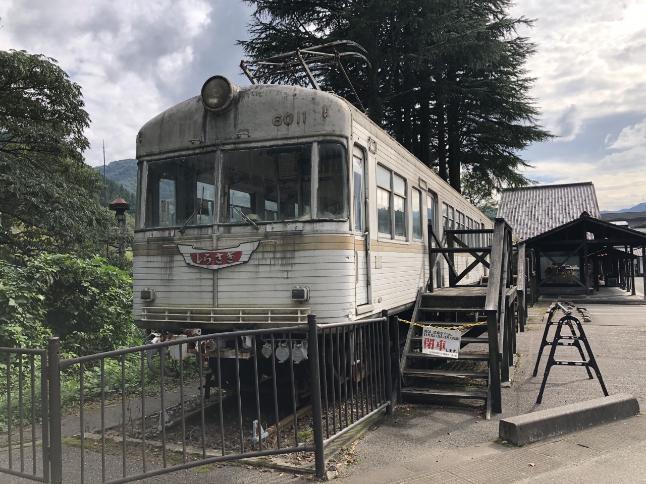 道の駅の左手には、大井川鉄道から譲渡された「しらさき号」が目を引く。車内には入れなかったが、階段を登ると中を覗き見ることができた。ゆけむり健康村はお休みだったが、道の駅では地元の土産物を見ることができた。- 旅行時期