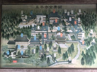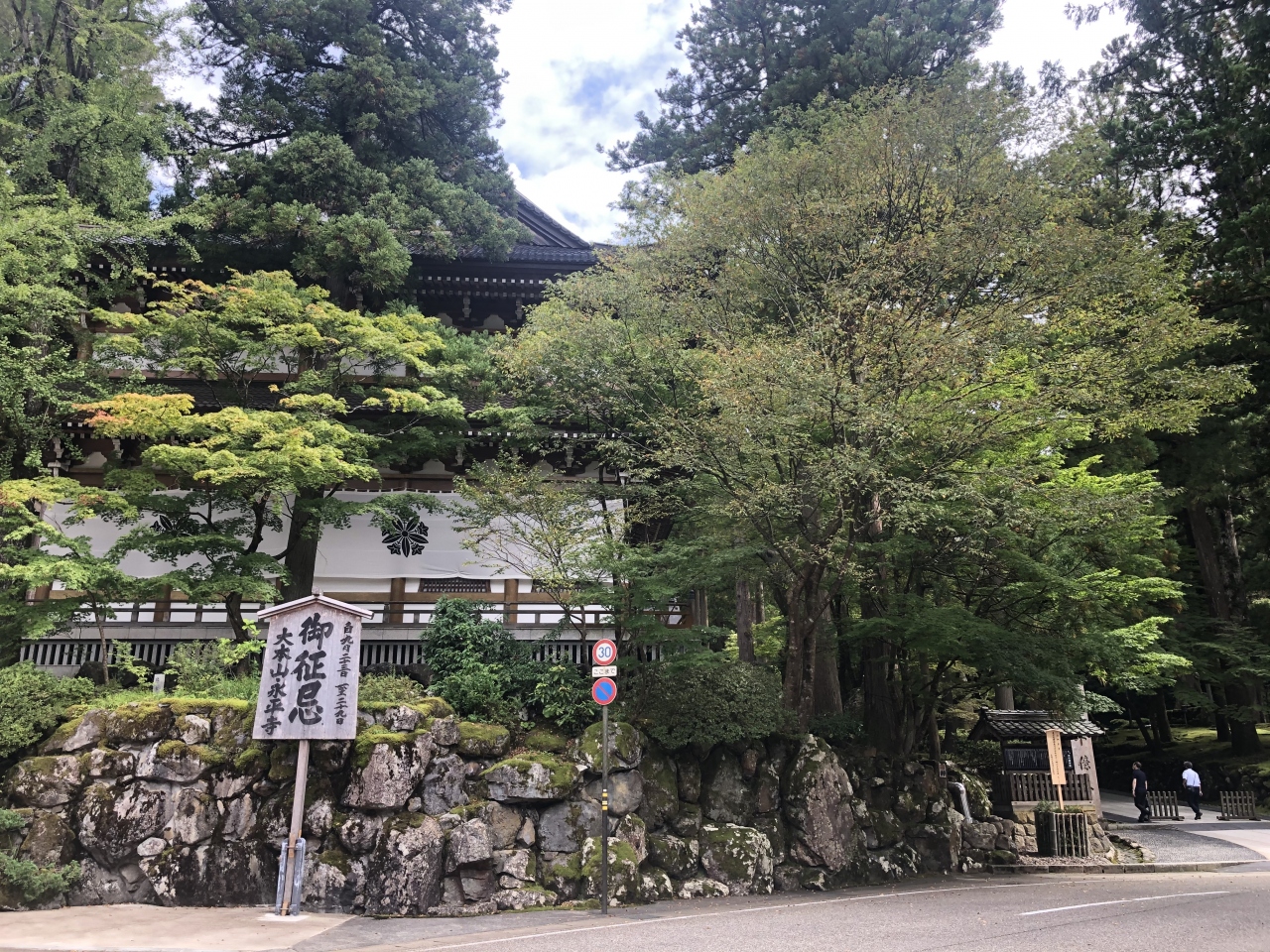 私は永平寺は初めて訪れた。曹洞宗の大本山。1244年に道元禅師によって出家参禅の道場として開創された。樹齢680年といわれる老杉に囲まれた敷地には、「七堂伽藍」をはじめとする70余りの殿堂楼閣が点在している。緊急事態宣言の中であり、入場できたのは残念ながら一部のみ、山門の奥にある仏殿、法堂、不老閣など主要な建物は次回のお楽しみとなった。- 旅行時期