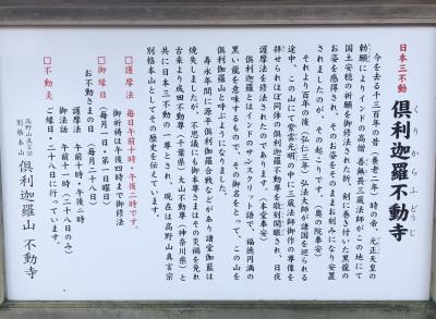 案内によれば、倶利迦羅不動寺の創建は718年、元正天皇の勅願により中国から渡来したインドの高僧、善無畏三蔵法師が倶利迦羅不動明王像を奉安したのが始まりと伝えられてる。また、それから約100年後の812年に、弘法大師が諸国を巡る途中で不動明王を拝まれ、自ら本尊と同体の不動尊像を彫り、御前立の不動尊として安置されたという。高台にあり周囲の眺めも良く、見どころも多く、ゆっくり散策することをお勧めしたい。- 旅行時期