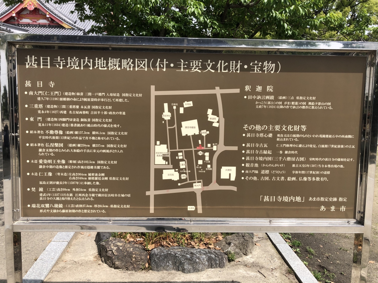 あま市にある真言宗智山派の寺院である。山号は鳳凰山、甚目寺観音は通称である。本尊は聖観音。高さ一尺一寸五分の秘仏であり、本堂に安置される十一面観音像は秘仏、胎内仏である。寺伝によれば、597年伊勢国の海人豪族である甚目龍麿が漁をしていたところ、当時海であったこの地付近で観音像が網にかかり、その観音像を近くの砂浜に堂を建て安置したのが始まりという。- 旅行時期