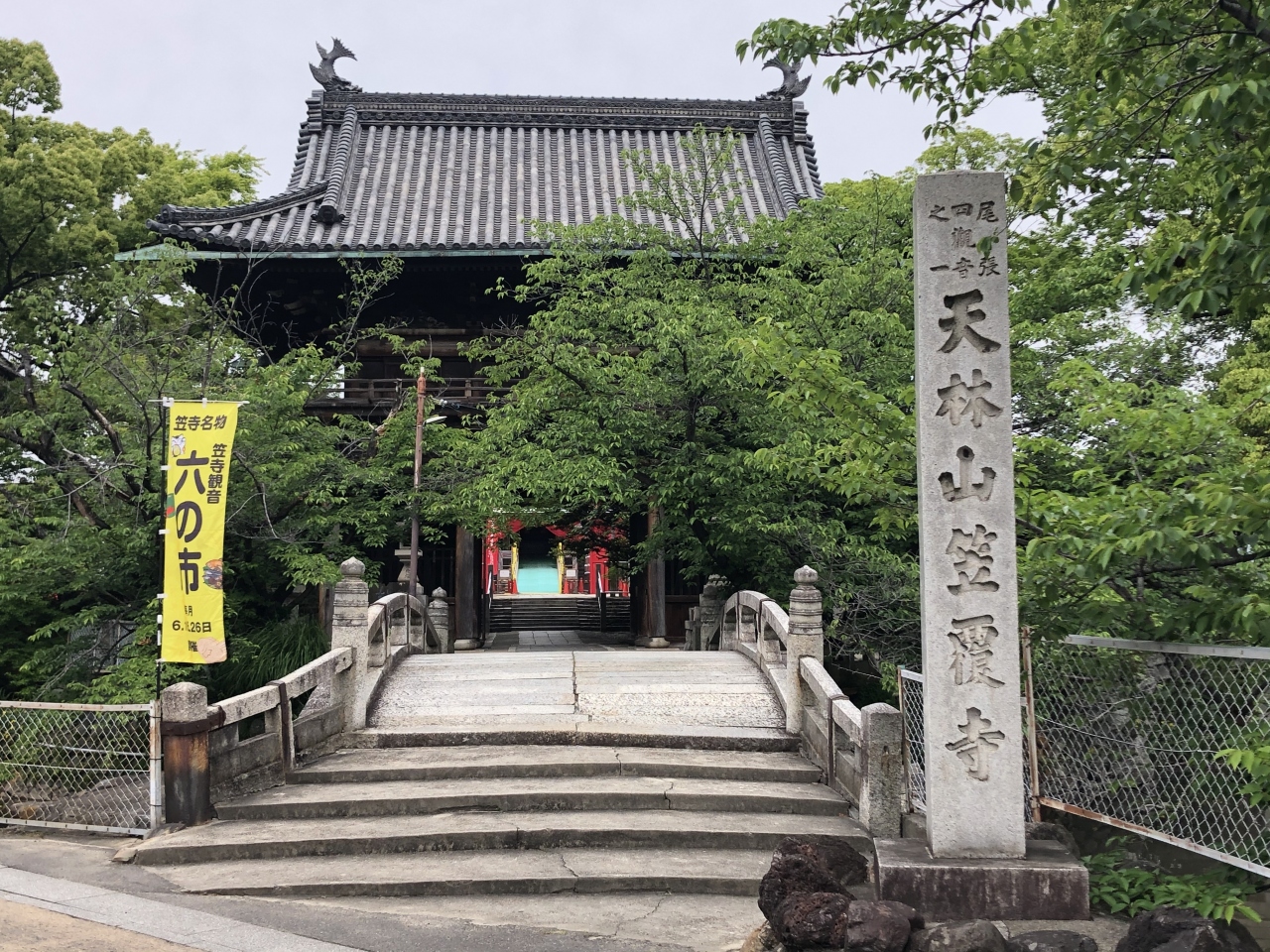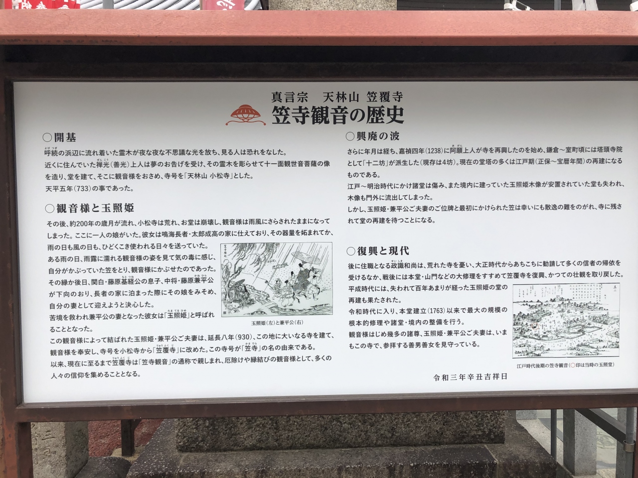 寺伝によれば、733年僧・善光が、呼続の浜辺に打ち上げられた夜な夜な不思議な光を放つ霊木を以て十一面観音像を彫り、その像を祀る天林山小松寺を建立した。その後約200年を経て旅の途中で通りかかった藤原兼平が、雨の日にこの観音像を笠で覆った鳴海家長・太郎成高の家に仕える娘を見初め、都へ連れ帰り玉照姫と名付け妻とした。930年この縁で兼平と姫により現在の場所に観音像を祀る寺が建立され笠覆寺と名付けられた。- 旅行時期