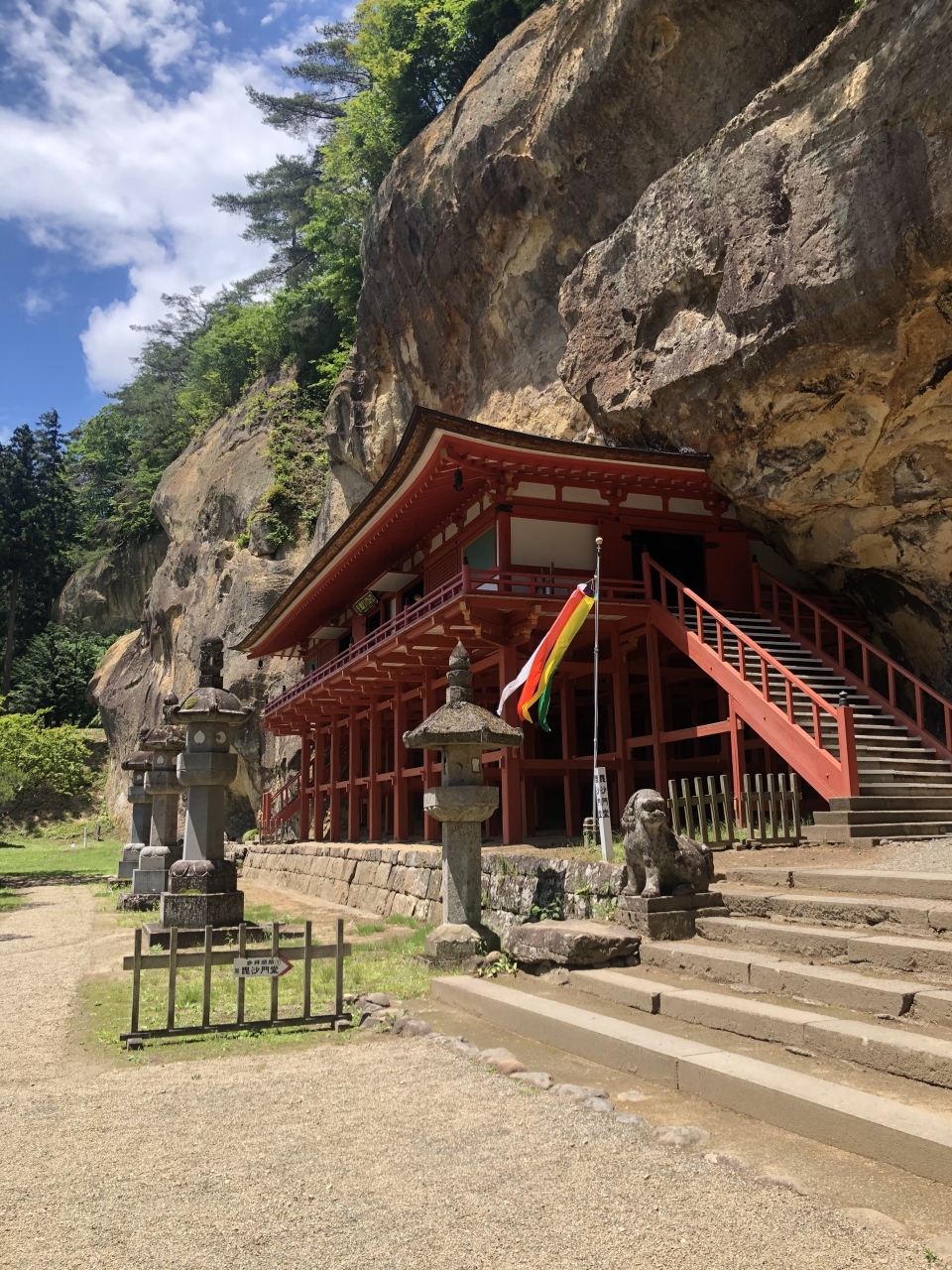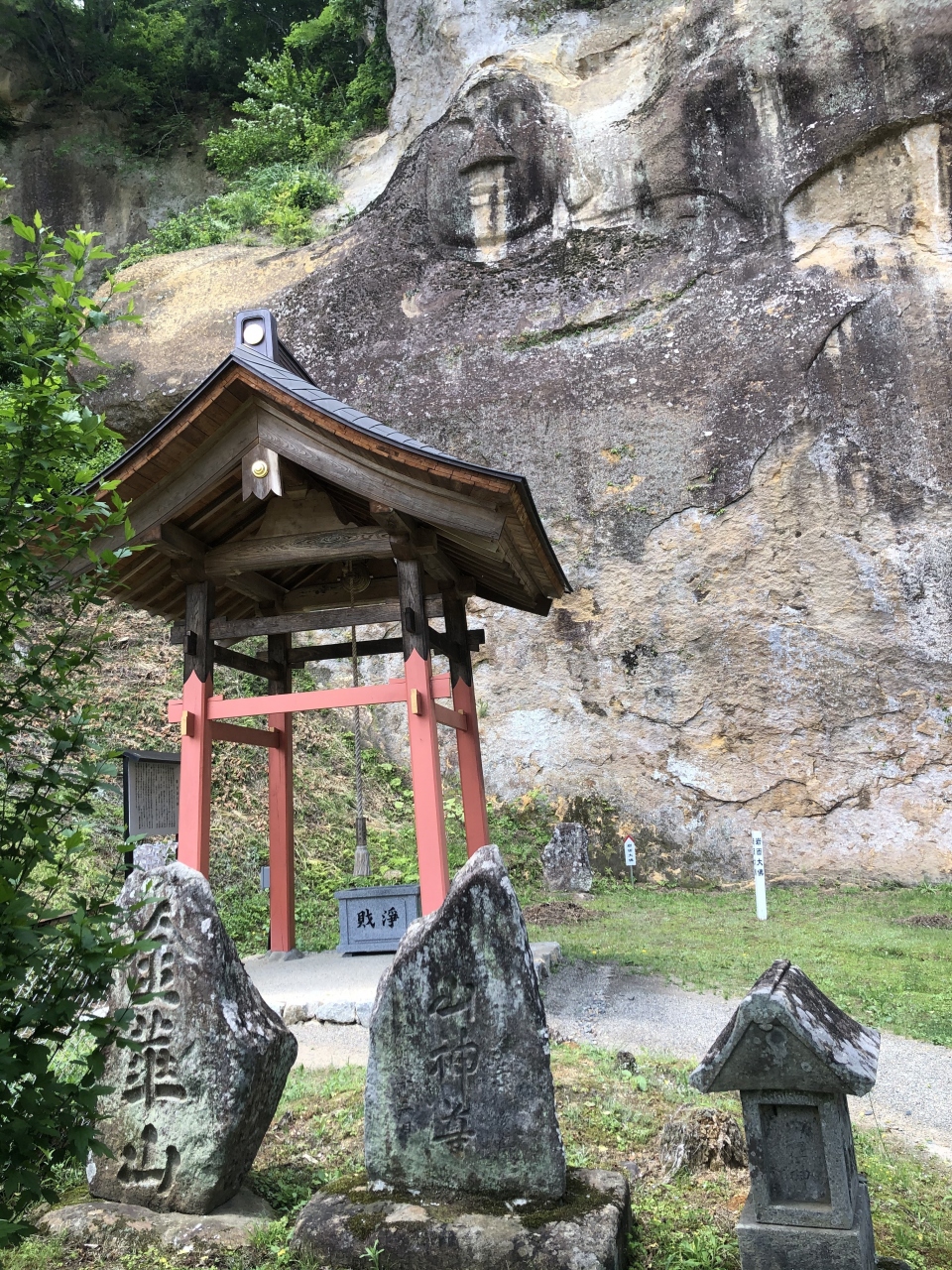 以前平泉を訪れた時にはとても徒歩やバスで行けるところではなく断念したが、今回車で達谷窟毘沙門堂を訪れた。平泉からは約6㎞の距離。2011年に平泉の建築、庭園と共に世界遺産に登録されている。達谷西光寺の名を持つが、入り口には鳥居があり驚かされる。神仏混淆の社寺の典型で入場料は400円。アジア各国で類似の仏教建築を見てきたが、日本では稀にみる素晴らしい岩屋懸造建築だ。