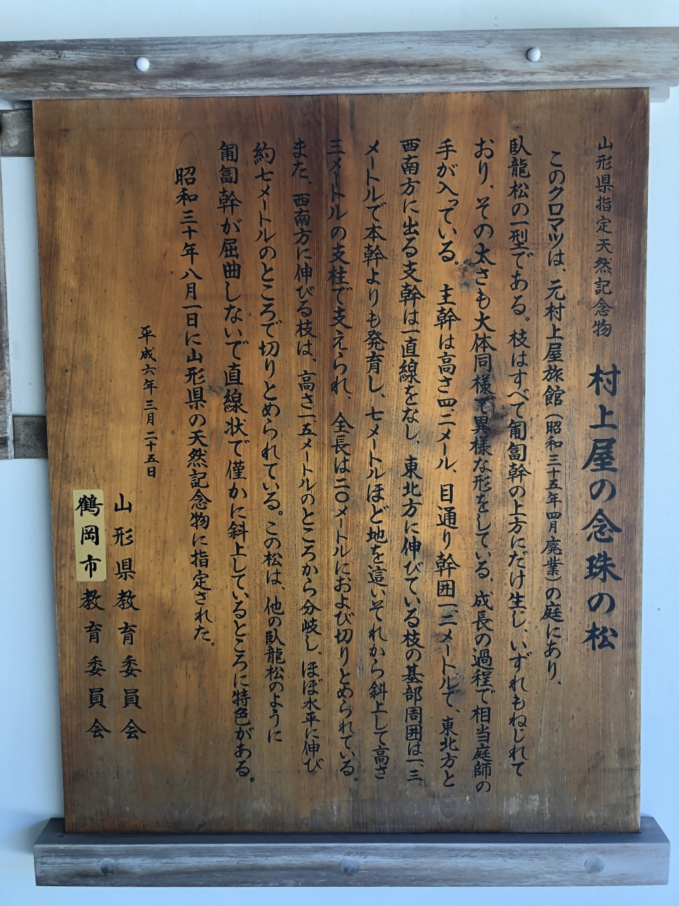 樹齢約400年の全長20mのクロマツであり、幹の高さは3.5m、幹囲り1.16m。東の方向に周囲1.3mの巨大な枝が這うよう伸びている。1955年山形県の天然記念物に指定され、1994年に造園家中島健の設計により現在の庭園が完成している。- 旅行時期