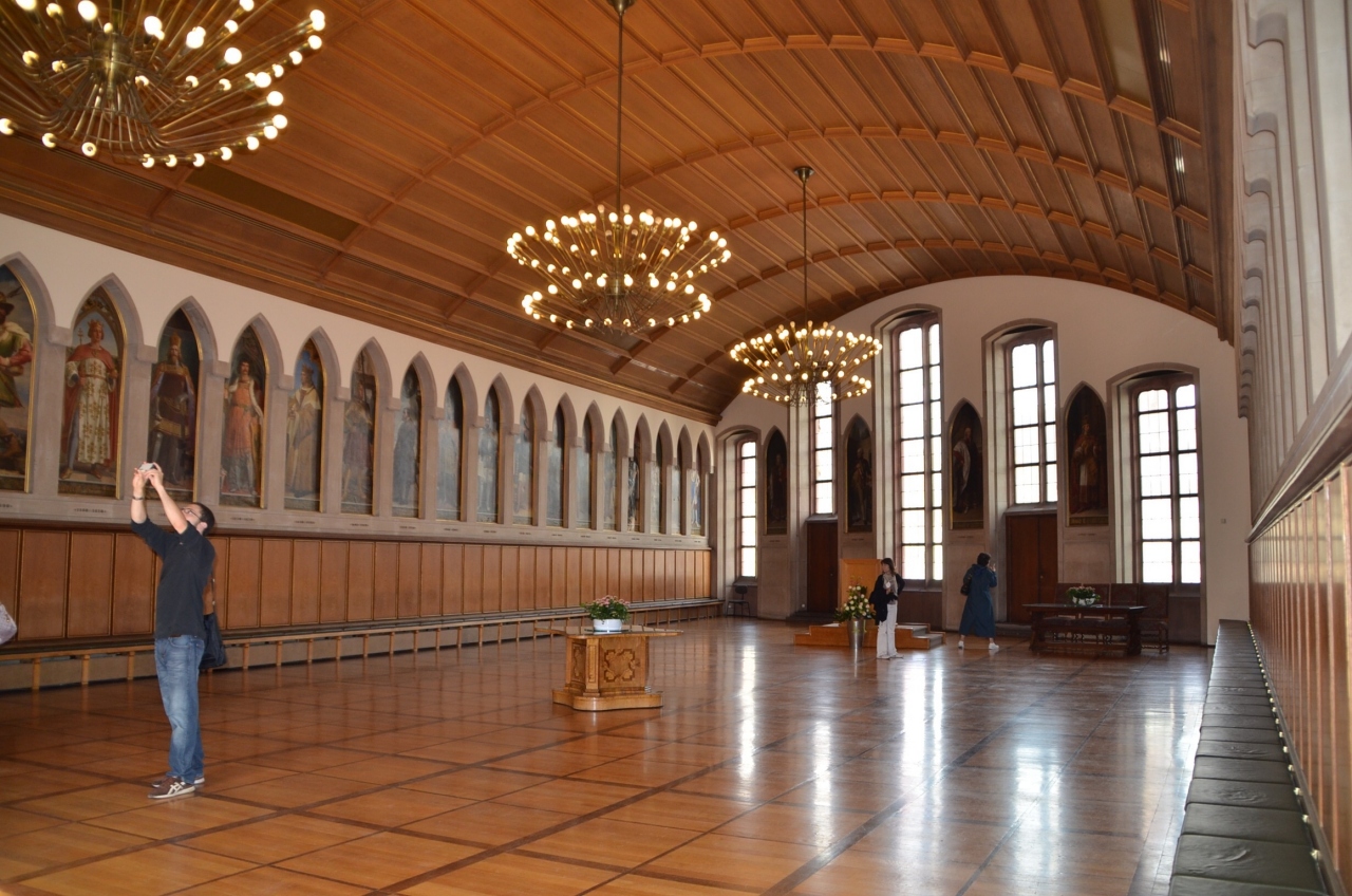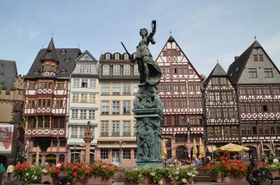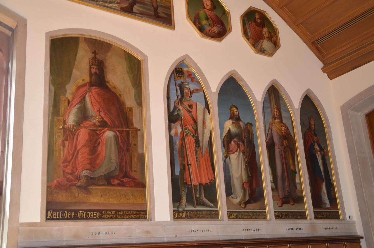 フランクフルトの象徴とも言えるレーマーとは、1405年ローマ人の豪商たちが宿泊していたレーマー(ローマ人)と呼ばれる館を市が買い取り、さらに隣接する両側の建物をつなぎ合わせ市庁舎とした建物だ。中庭への入り口を抜けると、戴冠式の晩餐会が開かれた部屋カイザーザール(皇帝の間)の入り口がある。自販機で2ユーロの入場料を払ってカイザーザールに入ると、カール大帝を始め歴代神聖ローマ帝国皇帝52名の等身大の肖像画を見ることができる。カール大帝は794年、フランクフルトを拠点にフランク王国の結束を図り、800年に教皇レオ3世からローマ皇帝に戴冠され、西ローマ帝国は復活した。
