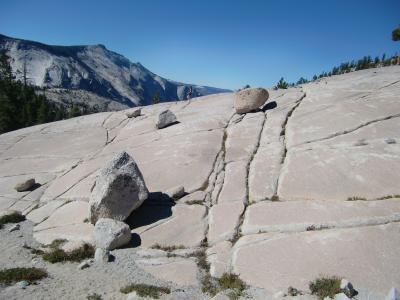 タイオガパスの途中にある絶景ポイント。氷河が運んできた巨岩も点在しており、岩山には氷河の爪痕がしっかり残っています。遠くにハーフドームが見えるのですが、これはトンネルビューなどで観るハーフドームの有名な方向の反対側から眺めていることになる訳で、なんだかすごく得した気分になります。ここから、ハーフドームへ続くトレイルもあるようで、健脚ハイカーの姿も見られます。