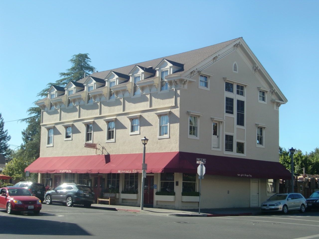 ソノマのダウンタウンにある旧いホテル。ロビーや廊下は歴史を感じさせますが、部屋やバス・トイレはキレイにリニューアルされており古臭い感じは全くありません。部屋は狭いが雰囲気があり最高です。17時からはロビーで無料のワインが飲めるし、朝食には美味しいパンのサービスもあり、196ドルはお得感あり。一階にある人気レストラン、Girl & Figもお薦めです。