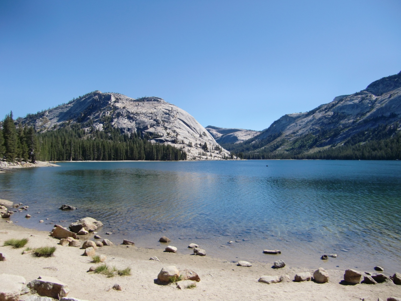 ヨセミテバレーから、タイオガロードに入りパノラマ街道と呼ばれる国道395号に抜ける道にあるテナヤ湖。ヨセミテバレーの混雑とは違い、森林の中を快適なドライビングができるタイオガロードのオルムステッドポイントと並ぶハイライトです。トイレもあるので長いドライブのトイレ休憩にも良いと思います。