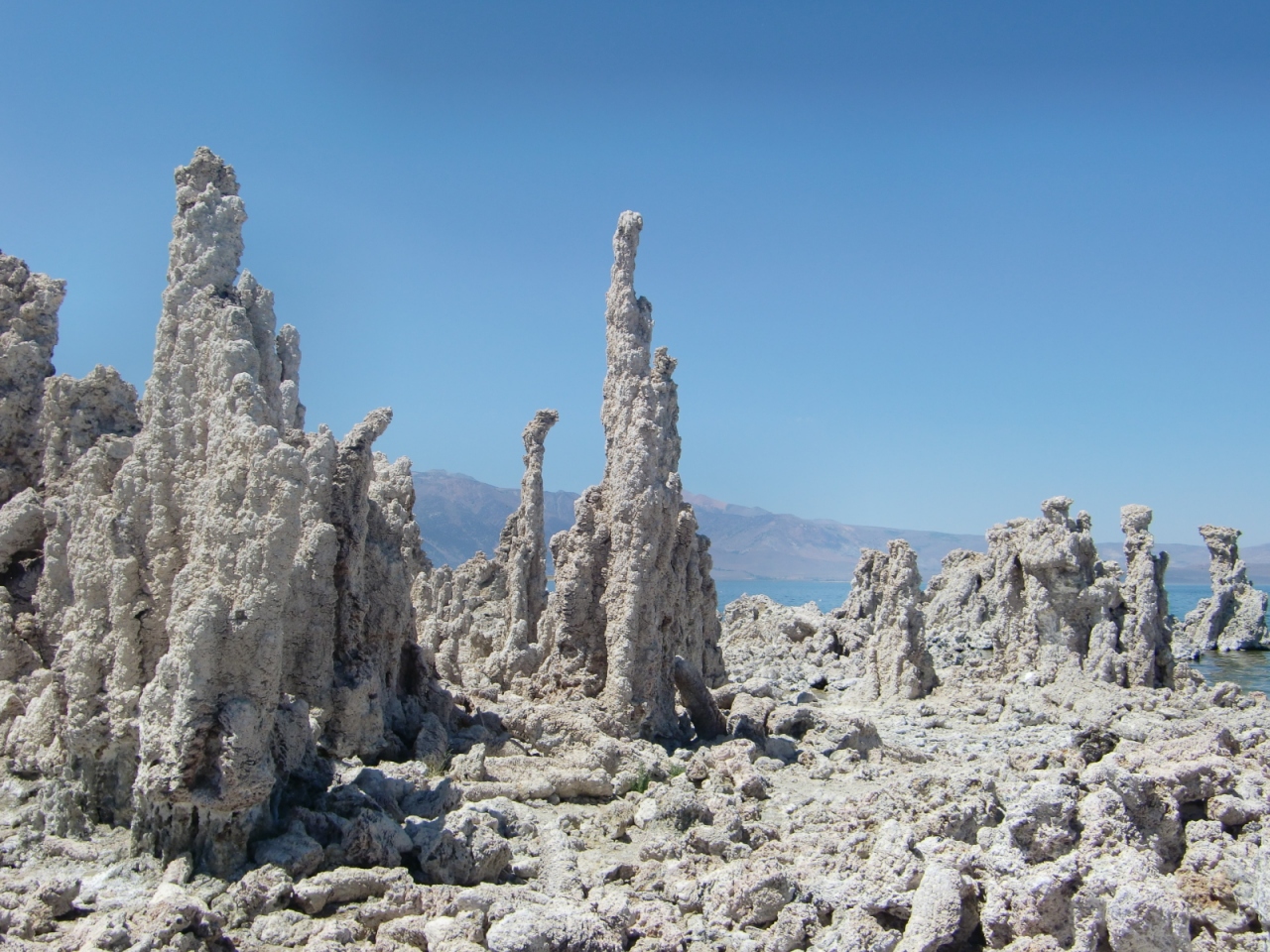 モノ湖は、四方を山に囲まれて流れ出す川がないために塩分濃度が高く特殊なエビやハエのみが生息する湖だそうです。モノ湖の南岸には、トゥーファタワーと呼ばれる奇岩があります。トゥーファタワーは、カルシウムを含む湧水が泡をたてて炭酸塩を多く含む湖水の中を上昇する時に炭酸カルシウムが生成され尖塔と丸い塊として形成されたものだそうで、元々は湖中にあったものが、1941年に水供給のため取水されて水位が下がったことで湖上に現れたとのこと。水とカルシウムだけでこれができてしまうとは本当に驚き。このトゥーファタワーを見られる南岸へは入場料、一人3ドルです。一見の価値ありです、是非立ち寄ってみてください。