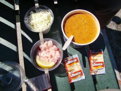 レストラン(店内)で食べるという選択肢もあるのですが、我々はテイクアウトを選択。海岸の公園で食べることにしました。サーモンチャウダーのボウルサイズ(優に二人分あります。)とシュリンプカクテルとコールスローサラダ。これで約10ドルはお値打ちです。海を見ながらの昼食。美味しかった~。