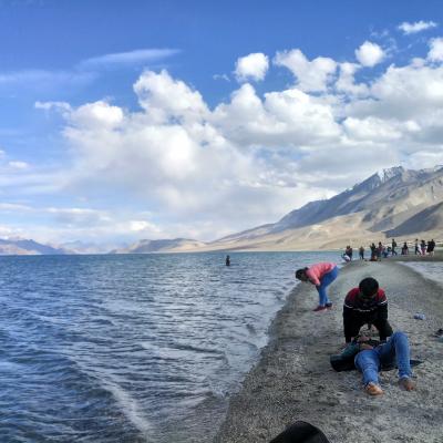 ネットをつなぎながら、景色を見たり、背伸びをしたり