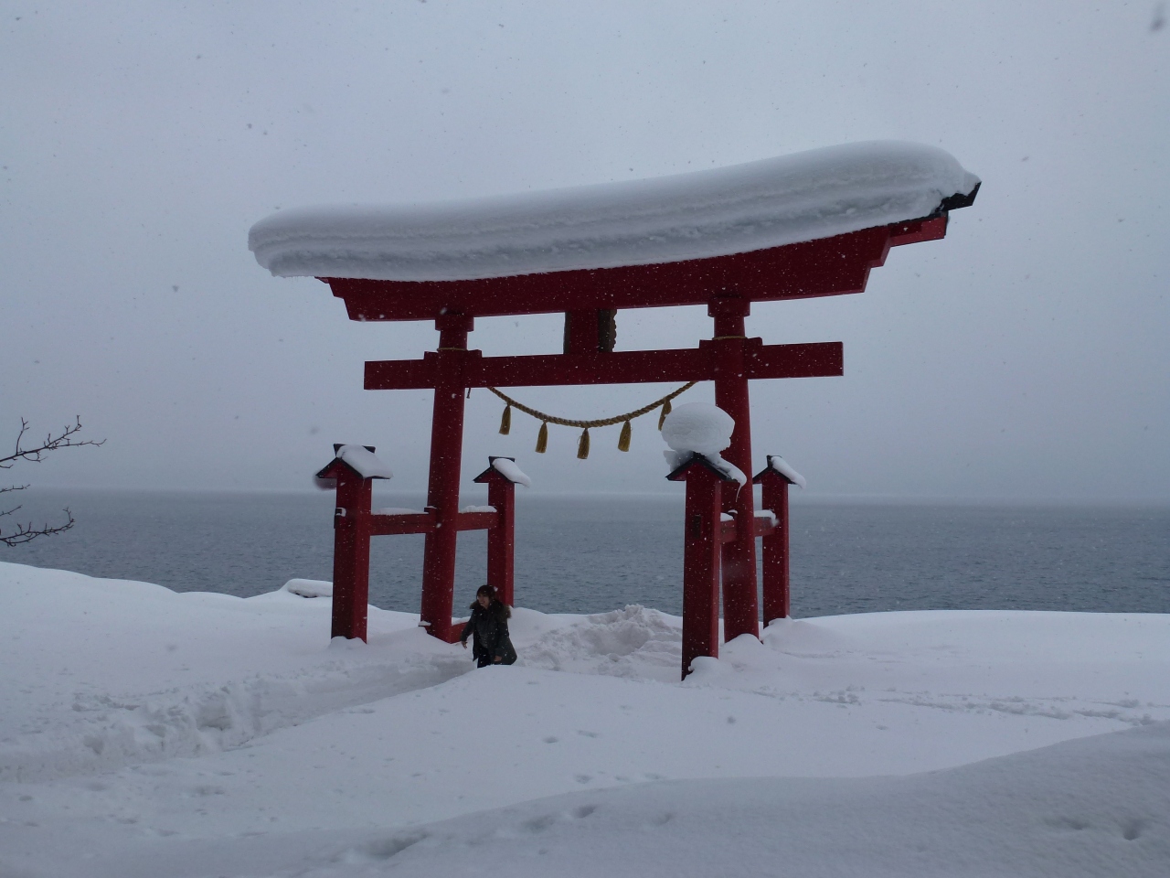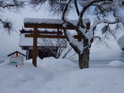 豪雪のため視界不良で、向こう岸が見えなくなっている『田沢湖』をバックに建つ「鳥居」が何とも神秘的で・・・というか、何か恐ろしさまで感じました。この光景にあって、湖畔に立つのは勇気がいると思いますよ、湖に引き込まれそうで・・・。- 旅行時期