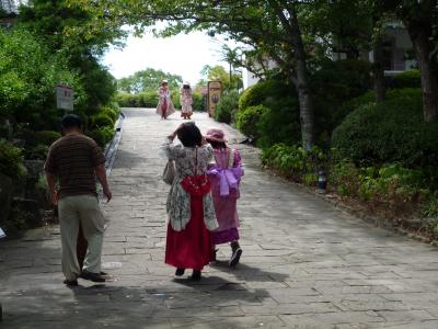 (グラバー園)--- レトロな衣装を着た若い女性たちも闊歩しています。