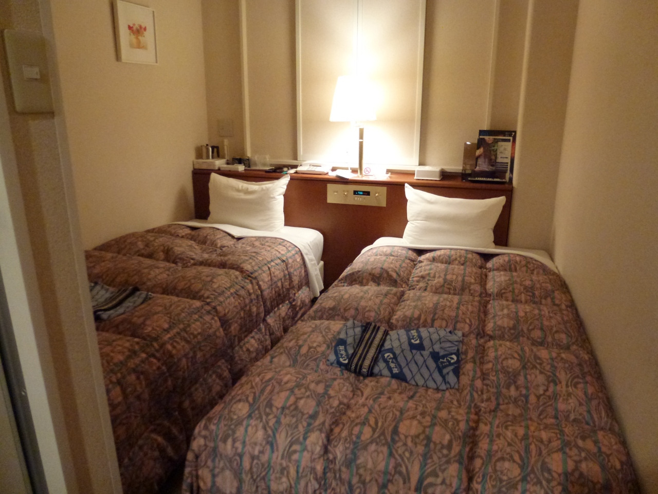 で、ホテルはというと、外観及び客室から判断するに、典型的なビジネスホテルタイプでした。なかなか清潔な感じで、そこは問題なかったのですが、私が泊まった部屋は・・・とにかく狭かったです。