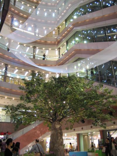 ゴールドメタリックの建物で、天神のど真ん中にある複合商業施設「イムズ」です。この施設の最大の特徴は、何といっても「吹き抜け」です。施設の真ん中を何階にも渡って吹き抜けているその景観は、まさに贅沢の一言です。